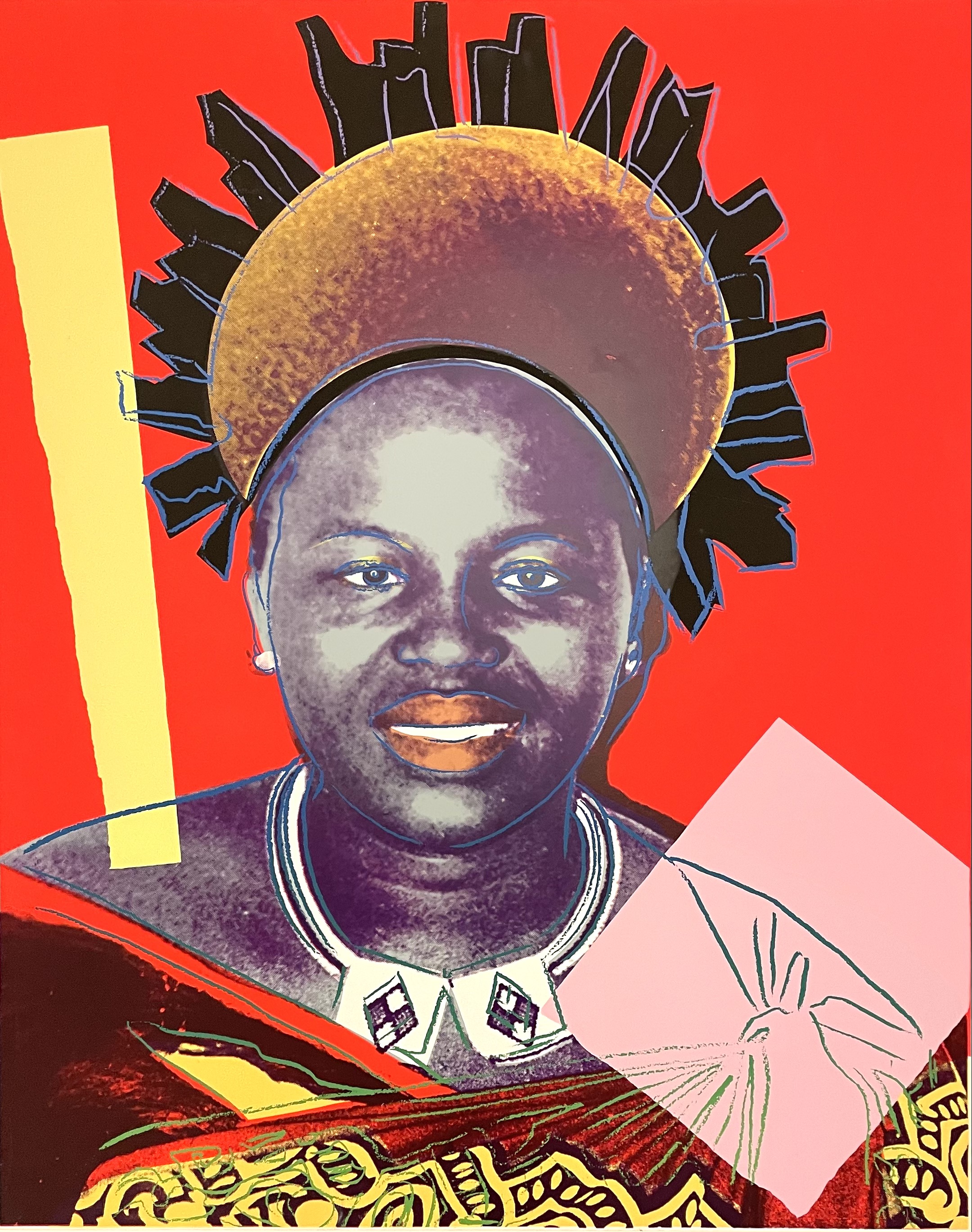 Stamped “The Estate of Andy Warhol”. Unique, unsigned proof. Queen Ntombi Twala of Swaziland (1985) von Andy Warhol ist ein einzigartiger Siebdruck aus der Serie Reigning Queens. Die Königin erscheint vor einem kräftig roten Hintergrund, mit traditioneller Kleidung und einem grafischen Heiligenschein. Warhol kombiniert fotografischen Realismus mit poppigen Farbflächen und betont so die Symbolkraft königlicher Ikonografie. Das Werk thematisiert Macht, Repräsentation und globale Popkultur.