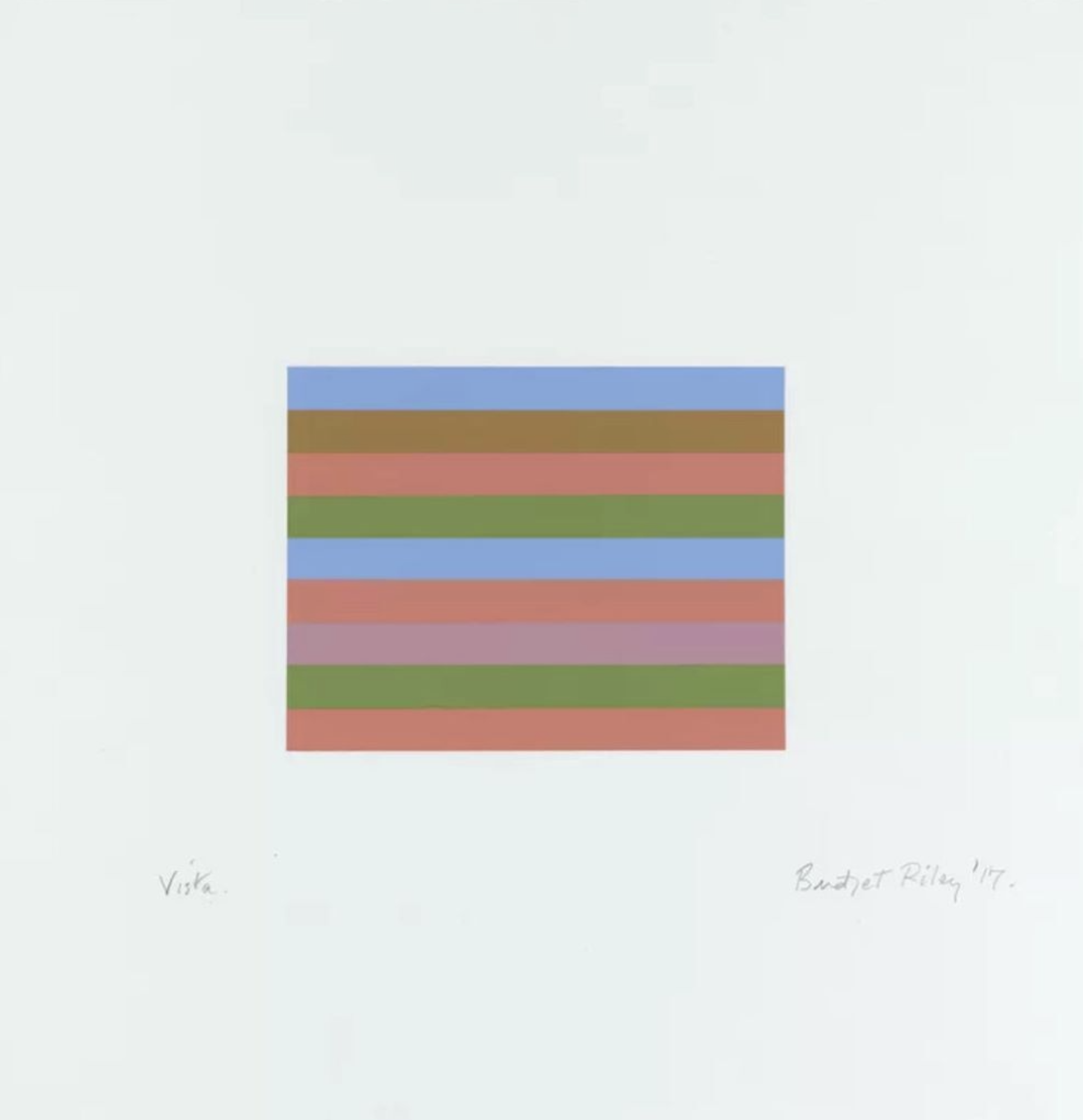 Screenprint in five colours plus white on wove paper. In Vista (2017) untersucht Bridget Riley den chromatischen Rhythmus durch horizontale Streifen in fünf Farben und Weiß. Jede Linie ist präzise auf Velinpapier gedruckt und erzeugt eine visuelle Kadenz zwischen Harmonie und Kontrast. Die Anordnung der Farbtöne – Blau, Grün, Orange, Mauve und Terrakotta – entfaltet eine pulsierende Bewegung, die strukturiert und zugleich fließend wirkt. Dieser Siebdruck zeigt Rileys reife Op-Art-Praxis, bei der Farbdynamik das räumliche und sinnliche Erleben steuert. Auflage von 150 Exemplaren.