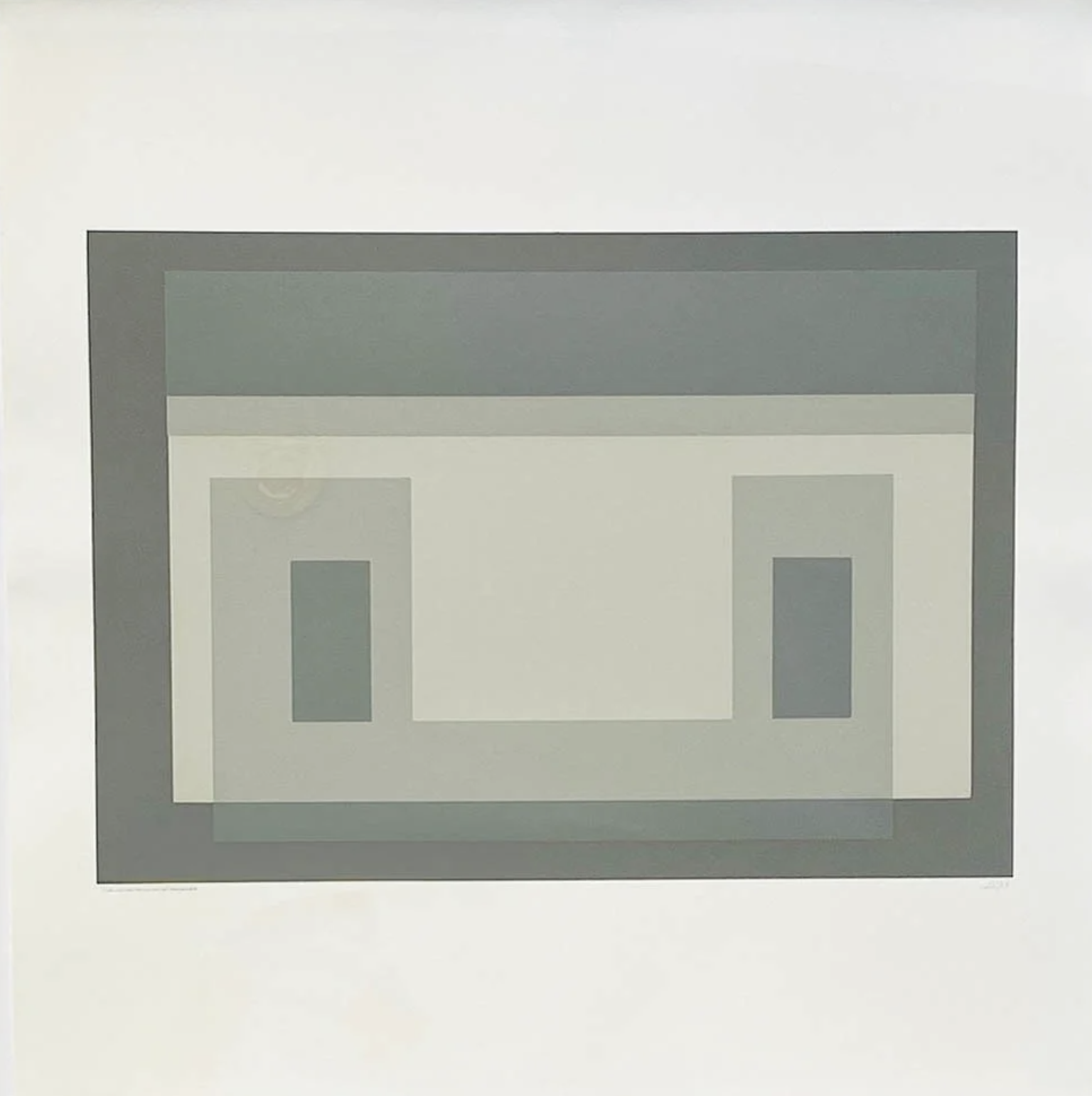 Screenprint in colors, on Rives BFK paper. Signed, Titled, Dated and Numbered. Variants-III (1966) von Josef Albers gehört zur Serie Ten Variants und setzt seine Untersuchung zu Farbverhältnissen und Raumwahrnehmung fort. Der Siebdruck zeigt ein gedämpftes Farbspektrum aus Grau- und Grüntönen, die in rechteckigen Formen angeordnet sind. Albers erzeugt durch präzise Gestaltung eine Illusion von Tiefe auf der flachen Oberfläche. Die Arbeit spiegelt seine Bauhaus-Tradition und seinen systematischen Zugang zur Abstraktion wider, bei dem minimale Farbveränderungen starke visuelle Effekte hervorrufen.