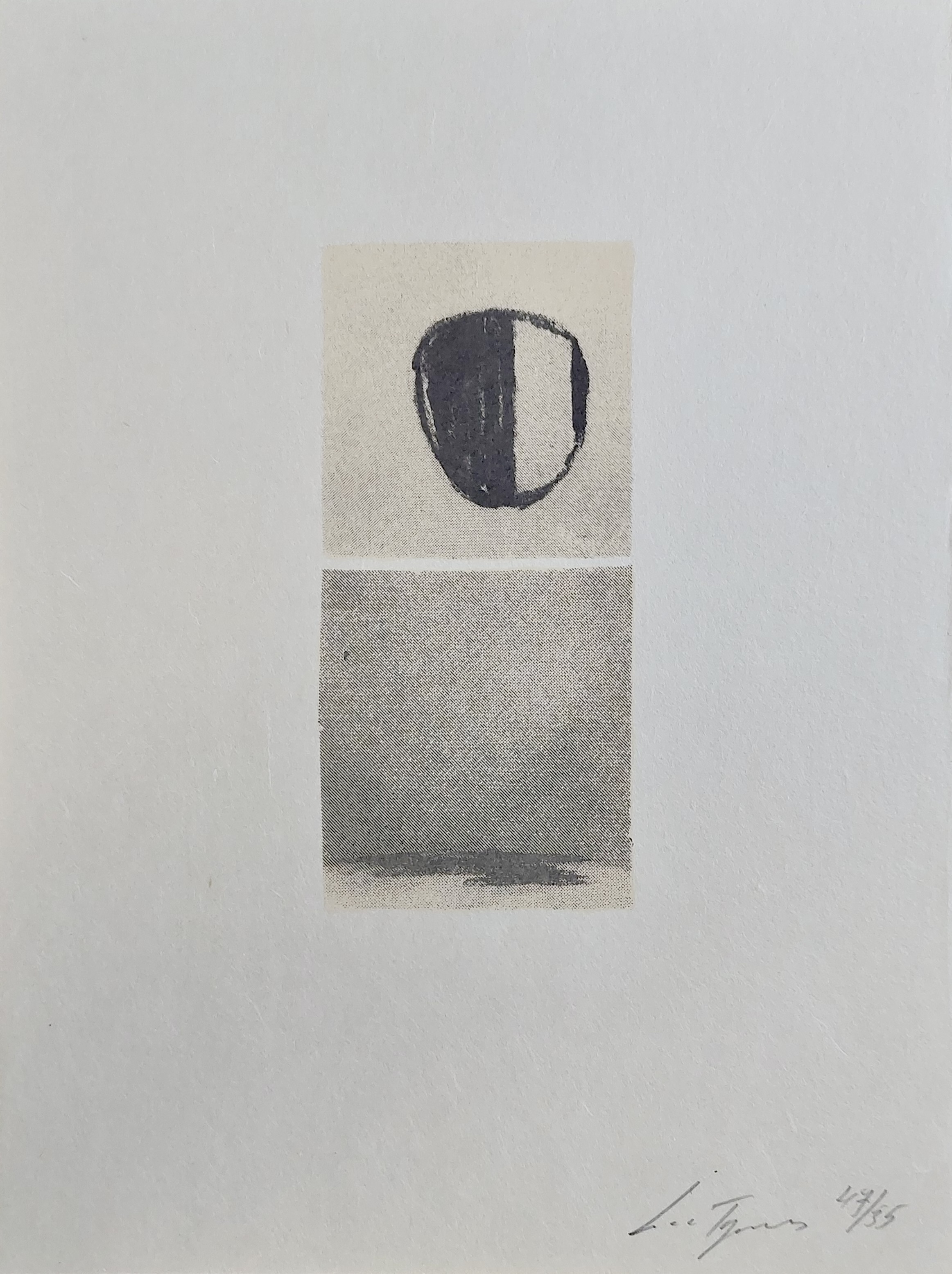 'Het versluierd beeld' (2001) von Luc Tuymans ist ein Siebdruck auf Simili-Japanpapier, der durch seine stille und rätselhafte Bildsprache auffällt. Die Komposition zeigt zwei übereinanderliegende Rechtecke: oben eine dunkle, rundliche Form mit heller Vertikalfläche – eine abstrahierte Anspielung auf ein Gesicht oder eine Maske; unten ein nebliger Bereich, der an einen Schatten oder ein diffuses Landschaftselement erinnert. Der Titel, 'Das verschleierte Bild', verweist auf Tuymans’ Interesse an Verschleierung, Erinnerung und der Begrenztheit des Sehens. Die Arbeit erschien in einer Auflage von 55, signiert und nummeriert vom Künstler, gedruckt von Roger Vandaele und herausgegeben von CIAP in Hasselt.