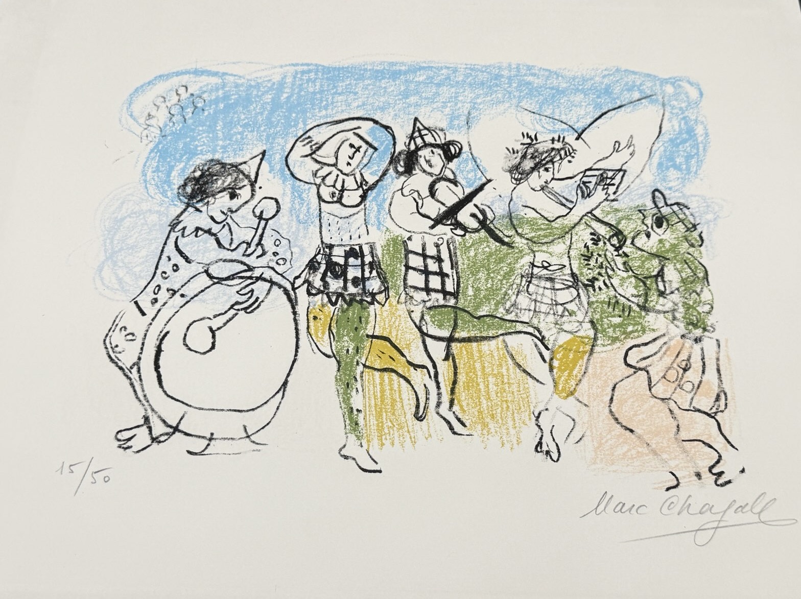 Lithograph in colors on Arches paper. Signed and numbered in pencil in the lower margin: Marc Chagall. Image: 9.5 x 13.5 in; Sheet: 14 x 18 in. Les Petits Arlequins (Die kleinen Harlekine) von Marc Chagall, entstanden 1962, ist eine Farblithografie auf Arches-Papier, die eine lebendige Parade von Harlekinen und Musikern zeigt. Mit Chagalls charakteristischer, frei fließender Linienführung und einer sanften Pastellpalette verbindet die Szene theatralische Fröhlichkeit mit traumhaftem Charme. Figuren in gemusterten Kostümen tanzen, musizieren und treten mit Tieren auf, was den festlichen Geist von Zirkus und Commedia dell’arte heraufbeschwört. Diese limitierte Auflage von 50 Exemplaren ist vom Künstler mit Bleistift signiert und nummeriert und demonstriert Chagalls Fähigkeit, Fantasie und Freude in der Lithografie zu vereinen.