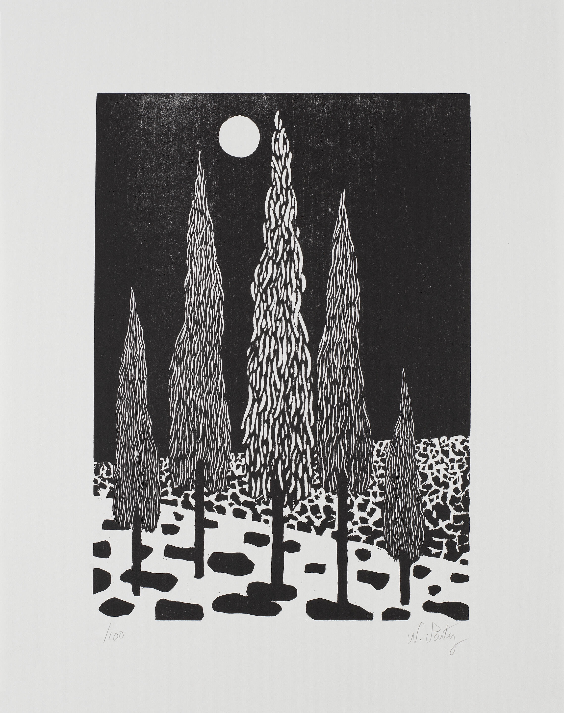 Woodcut on Rives BFK - Hand signed and numbered by the artist, recto. // Trees von Nicolas Party (2020) ist ein Holzschnitt in limitierter Auflage, der seine Affinität zur Natur und die Stilisierung natürlicher Formen zeigt. Die Komposition zeigt eine Gruppe von hohen, schlanken Bäumen, die sich als Silhouetten vor einem dunklen Hintergrund abheben, mit einem Vollmond darüber. Die filigranen Muster in den Baumstämmen und dem Laub verleihen dem Werk eine strukturierte, fast surreale Qualität und betonen Party’s Fähigkeit, naturalistische und fantastische Elemente zu verbinden. Die schwarz-weiße Farbpalette erzeugt einen auffälligen Kontrast und verstärkt die ätherische und traumhafte Atmosphäre der Szene. Gedruckt auf Rives BFK-Papier ist der Holzschnitt vom Künstler handschriftlich signiert und nummeriert und Teil einer exklusiven Auflage von 100 Exemplaren. Trees spiegelt Party’s Erforschung von Landschaften wider und zeigt seinen einzigartigen Ansatz, vertraute Themen in fesselnde, fast abstrakte Formen zu verwandeln.