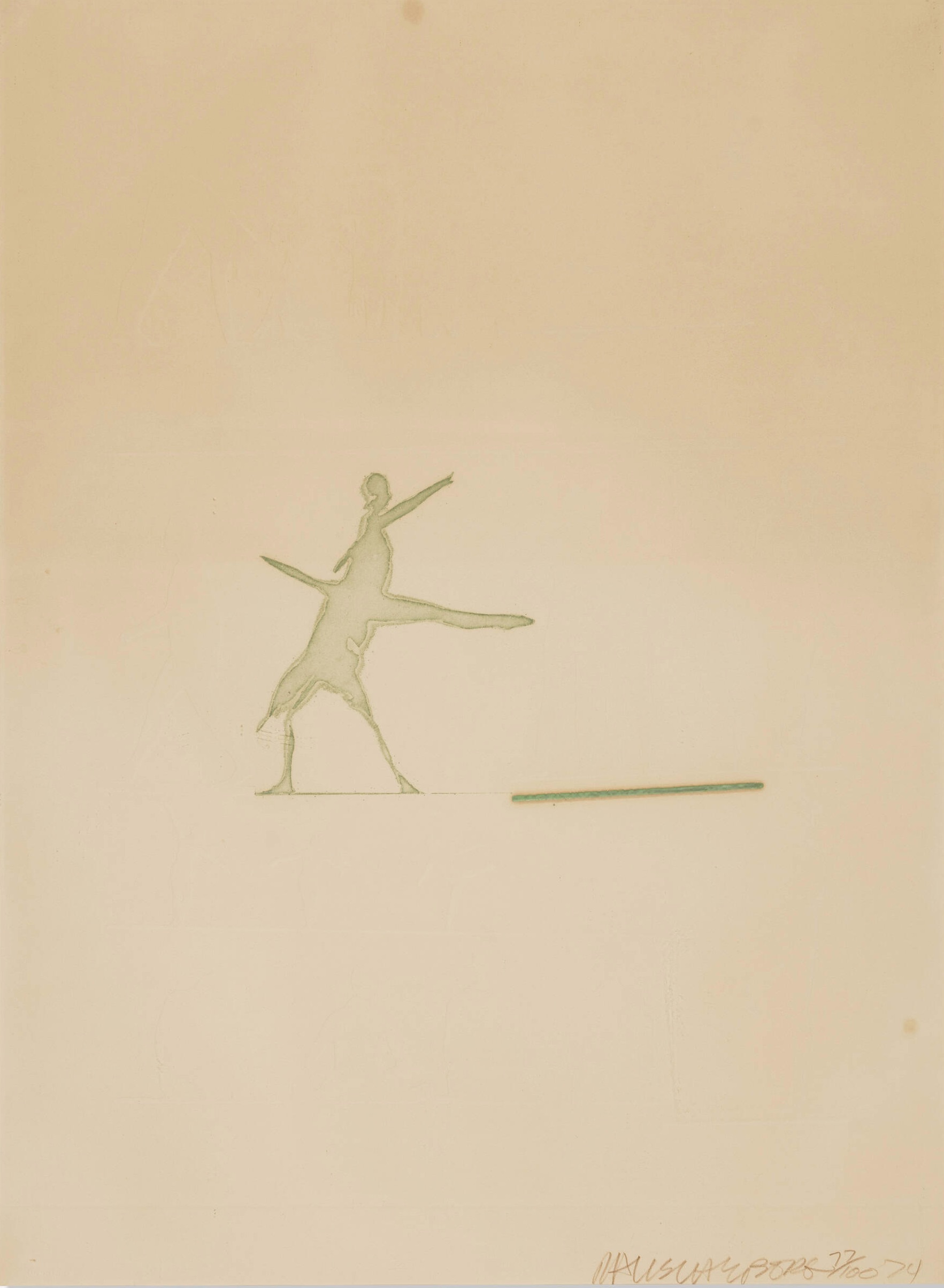 Prägung mit von Hand eingeriebener Halbtonstruktur. Unten rechts signiert, datiert und nummeriert, mit Blindstempel der Druckerei. Gedruckt von Untitled Press, Captiva, Florida, und gemeinsam herausgegeben von Multiples Inc., New York, und Castelli Graphics, New York. Dieses Werk wurde ursprünglich veröffentlicht und verkauft, um Mittel für die Merce Cunningham Dance Company in New York zu sammeln. Cunningham Relief (from the Merce Cunningham portfolio) (1974–75) von Robert Rauschenberg ist ein feines Relief mit von Hand eingeriebenem Rasterbild, geschaffen als Hommage an den Choreografen Merce Cunningham. Die Darstellung zeigt die zarte Umrisslinie einer tanzenden Figur in sanftem Grün auf cremefarbenem Grund, begleitet von einer horizontalen Linie, die eine Bühnenkante andeutet. Die Arbeit vermittelt ein Gefühl schwebender Bewegung – charakteristisch für Rauschenbergs Beziehung zur Performancekunst. In einer Auflage von 100 gedruckt, wurde das Werk zugunsten der Merce Cunningham Dance Company veröffentlicht und gehört zur Sammlung des Whitney Museum.