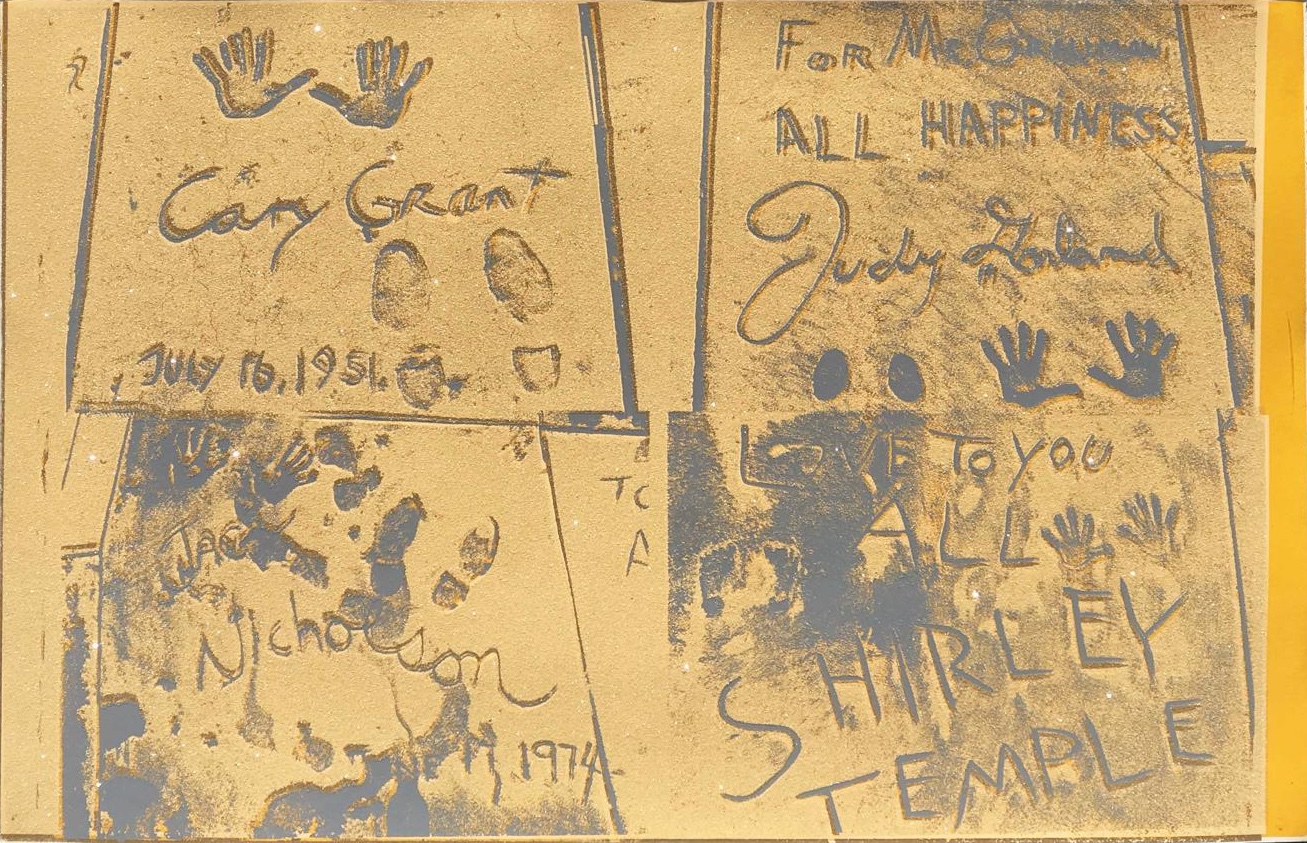 Screenprint on Dutch Etching paper with Diamond Dust. Sidewalk II.304 (1983) de Andy Warhol es una serigrafía sobre papel Dutch Etching con polvo de diamante, que refleja su obsesión por la fama. La obra reproduce los bloques de cemento con huellas y firmas de leyendas de Hollywood como Cary Grant, Judy Garland, Jack Nicholson y Shirley Temple. Warhol convierte estos gestos públicos en un homenaje brillante, elevando lo efímero a lo icónico mediante el polvo brillante.