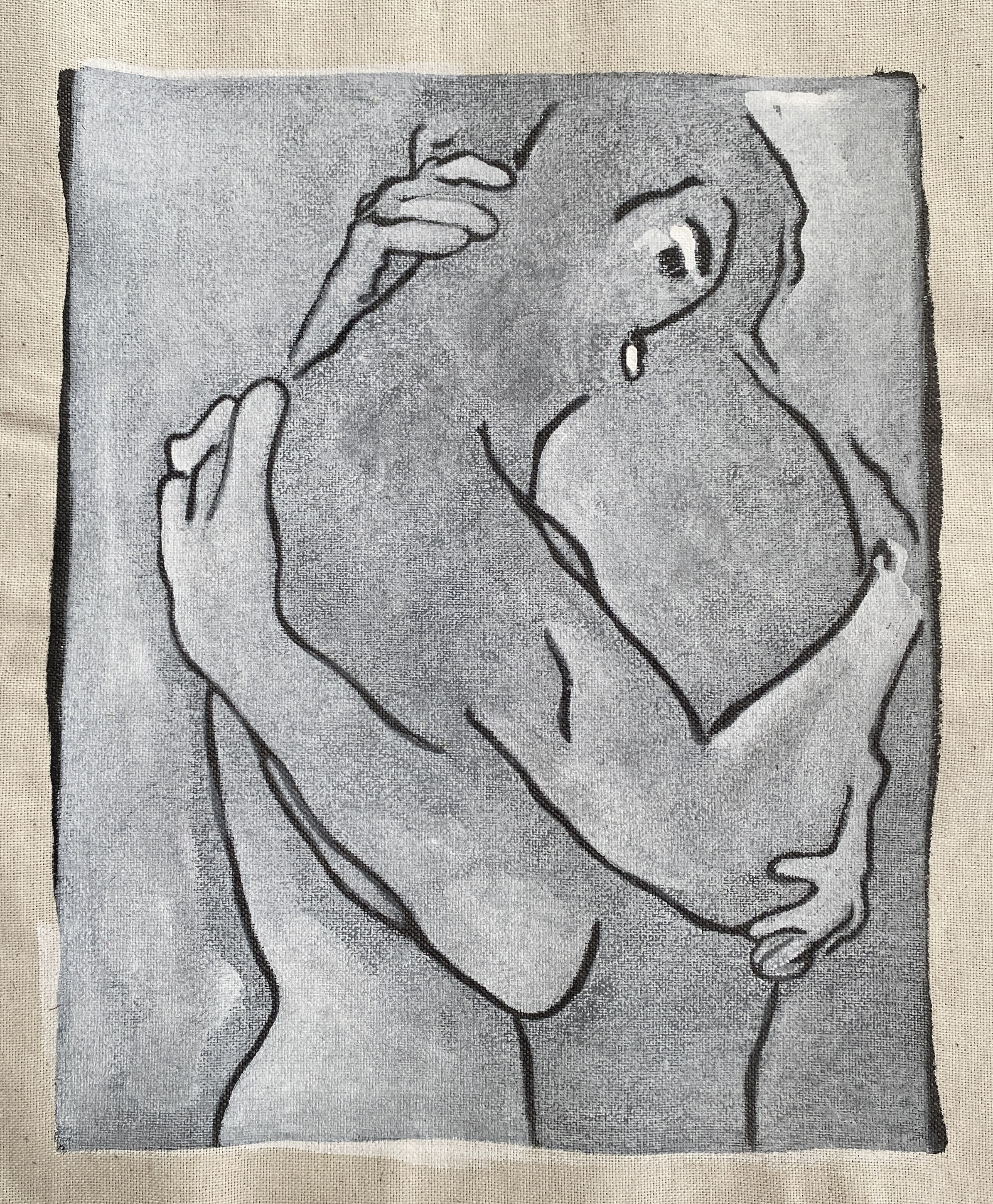 Linocot, hand painted , on canvas // Petit Câlin IV de Eva Claessens, creada en 2023, es una linografía de edición limitada, pintada a mano sobre lienzo. La obra representa un tierno abrazo entre dos figuras, retratado en un estilo minimalista pero cargado de emociones. Las figuras están dibujadas con audaces líneas negras sobre un fondo gris suave, y los delicados detalles, como los ojos cerrados y la expresiva posición de las manos, enfatizan la intimidad del momento. La textura del linograbado sobre lienzo añade profundidad, mientras que los detalles pintados a mano realzan la resonancia emocional de la pieza. Claessens captura la esencia de la conexión humana a través de su uso simple pero poderoso de la forma, invitando al espectador a reflexionar sobre los temas del amor, el consuelo y la cercanía emocional. Los bordes crudos del lienzo contribuyen a la sensación orgánica y personal de la obra.