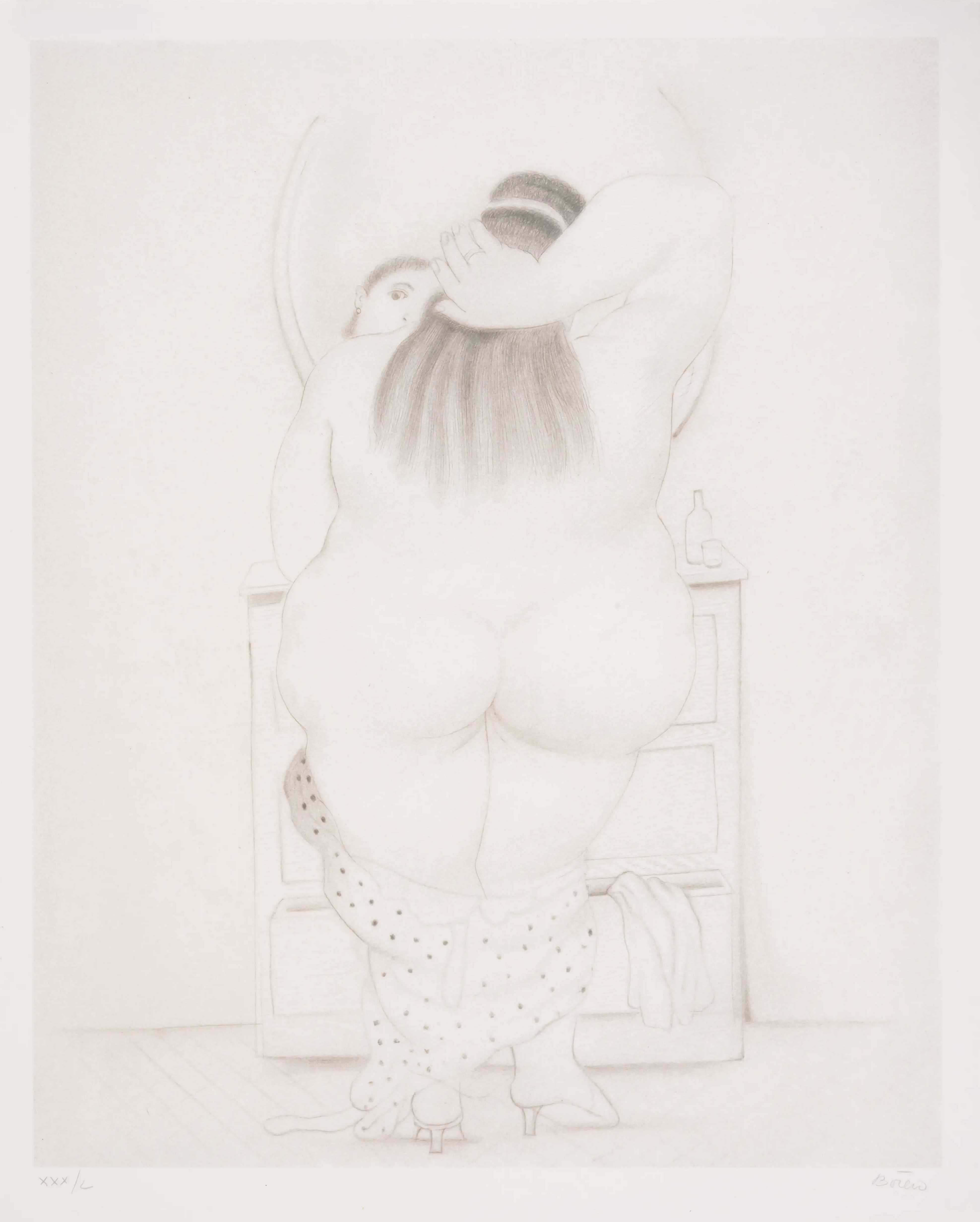 Offset lithograph on wove paper, signed and numbered in pencil. Published by Editions de la Différence. Esta litografía offset de Fernando Botero, realizada en 1984 para Dessins et Aquarelles, presenta su inconfundible estilo de figuras amplificadas y redondeadas. La escena muestra a una mujer desnuda de espaldas, parcialmente vestida, observándose en el espejo. Con trazos suaves y sombreados delicados, Botero transmite intimidad, sensualidad y un sutil sentido del humor. La figura corpulenta cuestiona los cánones tradicionales de belleza, celebrando la forma humana. Firmada a lápiz y numerada en números romanos (edición de L), fue publicada por Editions de la Différence, París.