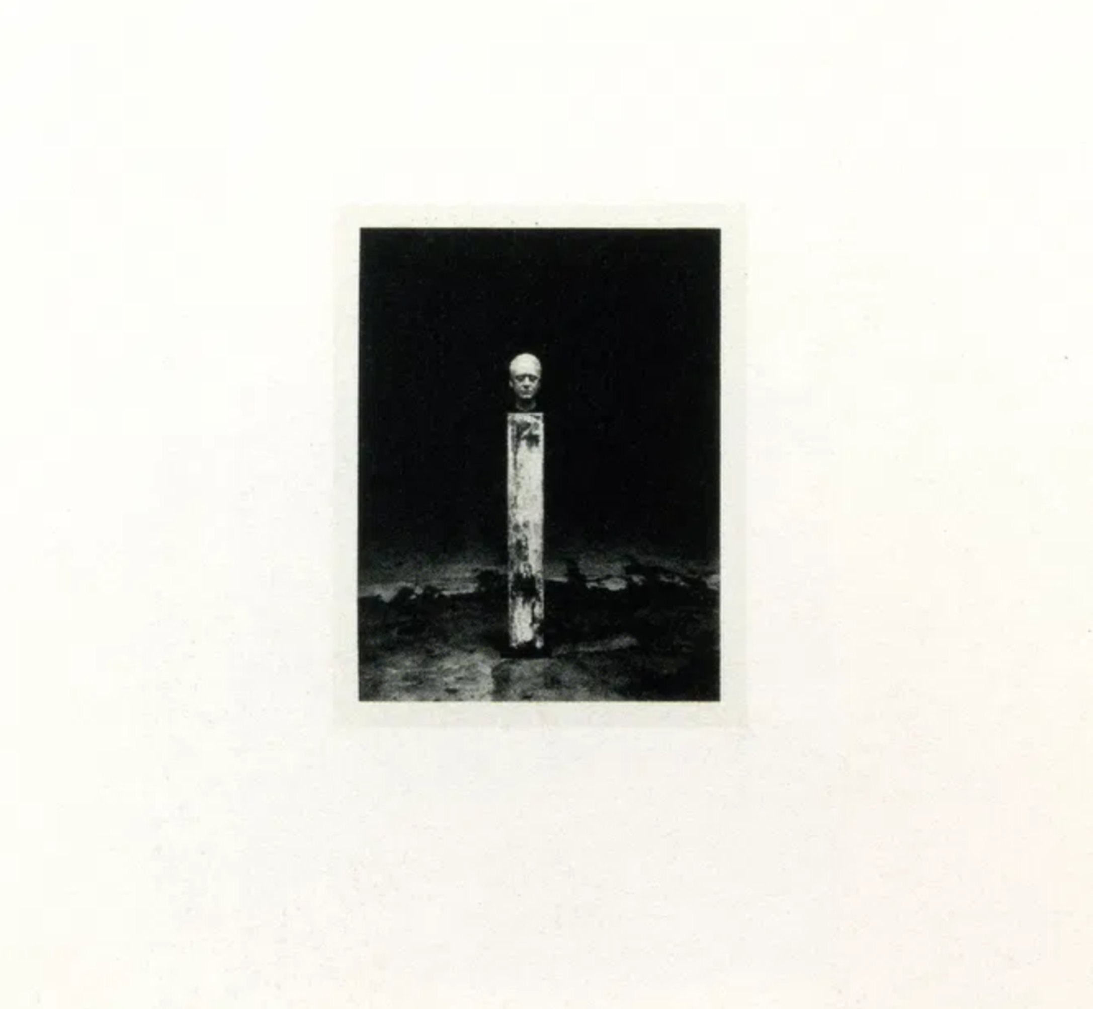 Offset print with varnish coating on chromo board. Self-portrait de Gerhard Richter, realizada en 1971, es una impresión offset con barniz sobre cartón cromado, de 21 × 23 cm, en una edición de 120 ejemplares. La imagen, sobria y en blanco y negro, muestra una cabeza sobre un poste desgastado, colocada en el centro de un entorno oscuro e indefinido. Richter transforma el autorretrato en una reflexión inquietante sobre la identidad, eliminando el cuerpo y reduciendo la figura humana a un emblema abstracto de introspección y anonimato.
