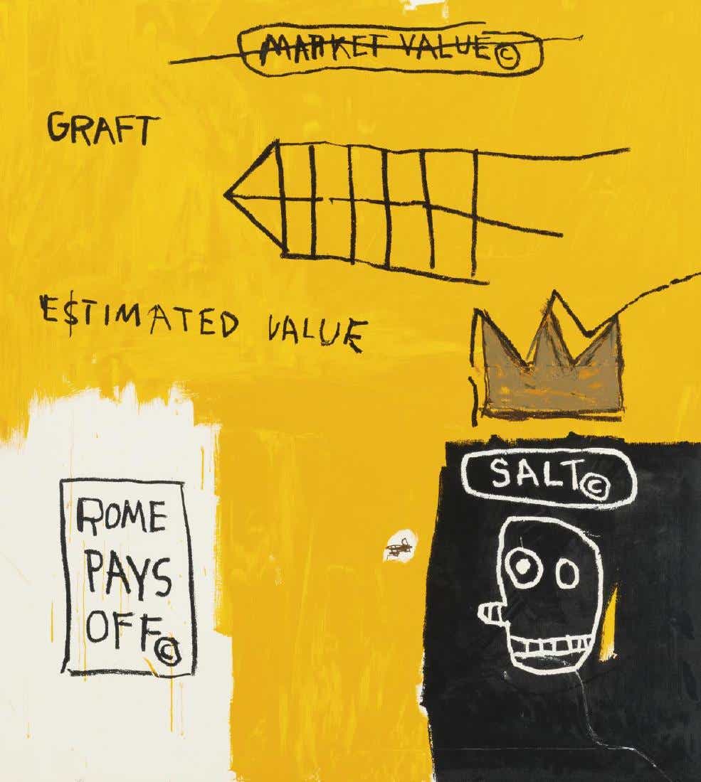 Original serigraph on Lenox Museum Board. Numbered and stamped by the artist's estate. Rome Pays Off de Jean-Michel Basquiat, creado originalmente en 1982 y reeditado en 2004 como serigrafía limitada, mide 111,7 x 101,6 cm. Esta obra, impresa en Lenox Museum Board en una edición de 85 ejemplares, captura la crítica de Basquiat al capitalismo, el valor y la identidad. Frases como MARKET VALUE, ESTIMATED VALUE y GRAFT destacan sobre el fondo amarillo, junto con su icónica corona, una figura esquelética y símbolos gráficos. La obra refleja su estilo espontáneo influenciado por el graffiti. La serigrafía está numerada y lleva el sello del patrimonio del artista.