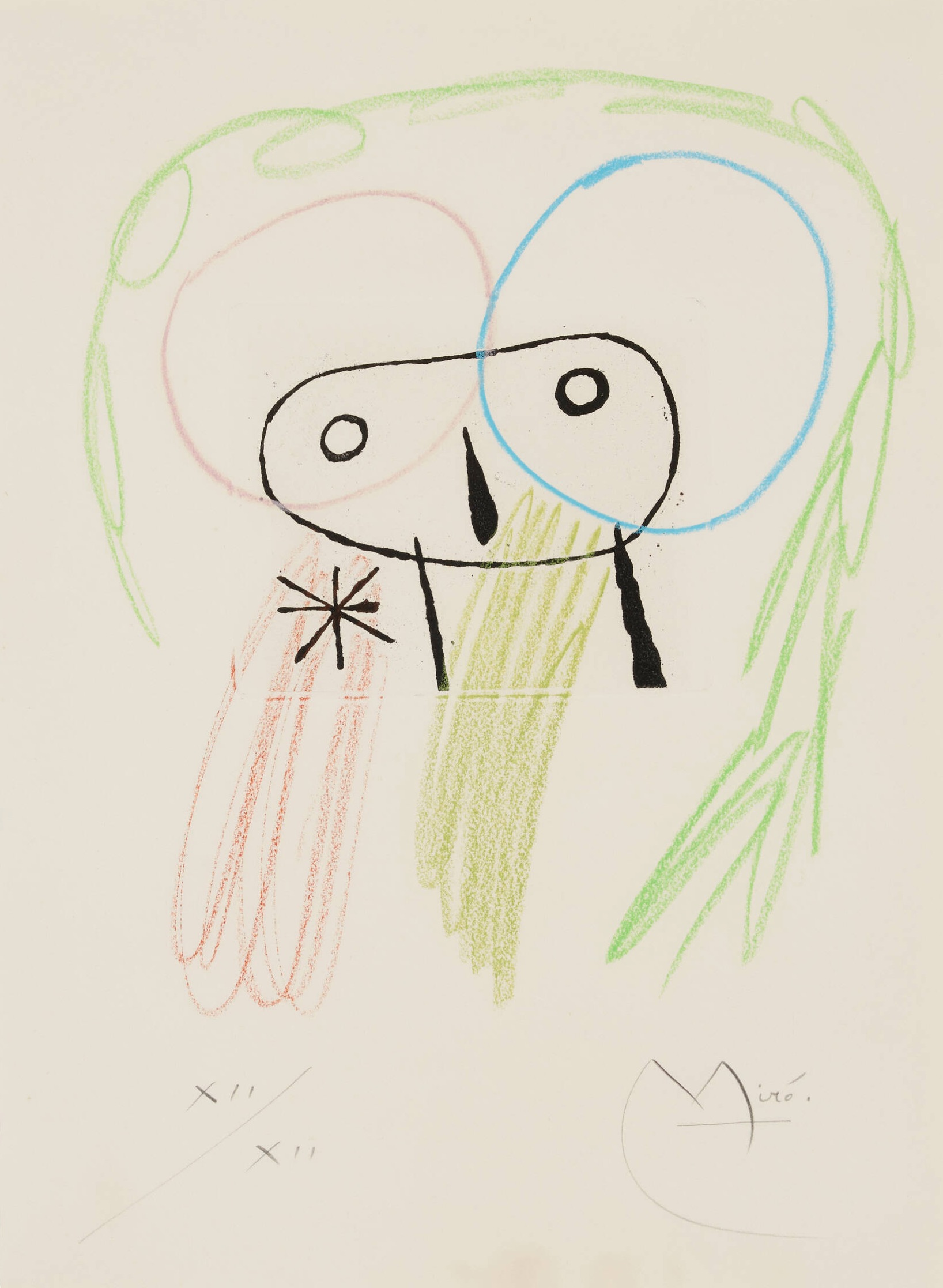 Aguatinta con color aplicado a mano en crayón sobre papel BFK Rives. Imagen: 27 × 24 cm Hoja: 38 × 28 cm Firmada y numerada en el borde inferior. Coprintada por Dutrou, París, y Atelier Crommelynck, París, y publicada por Louis Broder, París. Literatura: Dupin 132 | Cramer libros 45. Sin título (de la cartera La bague d’Aurore) de Joan Miró es un aguatinta de 1957 con coloración a mano en crayón sobre papel BFK Rives. La obra refleja el estilo surrealista característico de Miró, con formas biomórficas y líneas espontáneas. La figura central, similar a un rostro, está compuesta por formas simples, ojos circulares y colores vivos como rojo, verde, rosa y azul. La obra transmite un equilibrio lúdico entre el caos y la fantasía. Esta impresión forma parte de una rara edición de 12 ejemplares, coimpresa en París por Dutrou y el Atelier Crommelynck, y publicada por Louis Broder. Pertenece a la serie La bague d’Aurore, centrada en la abstracción, la poesía y la imaginación onírica.
