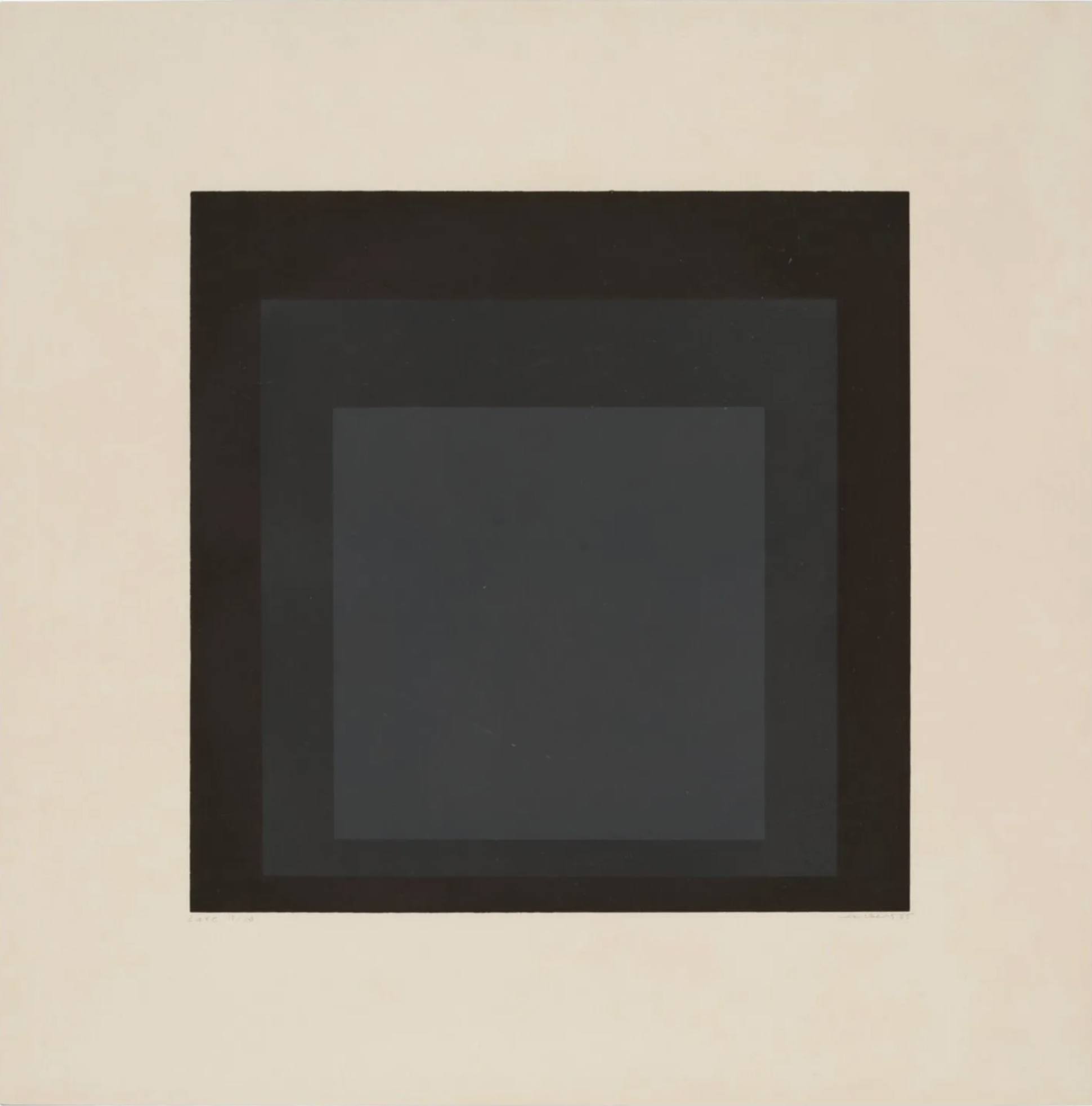 Color Screenprint. Signed, Numbered, and Dated. Late (1965) de Josef Albers es una obra destacada de la serie Soft Edge-Hard Edge, que investiga la relación entre color, forma y percepción. La serigrafía muestra cuadrados concéntricos en tonos de negro y gris sobre un fondo crema. La precisión geométrica de Albers y el efecto óptico generado por los cuadrados anidados reflejan su interés por la interacción del color en espacios definidos. Esta composición minimalista es reflexiva y rigurosa, y refleja sus raíces en la Bauhaus y su legado teórico sobre el color.