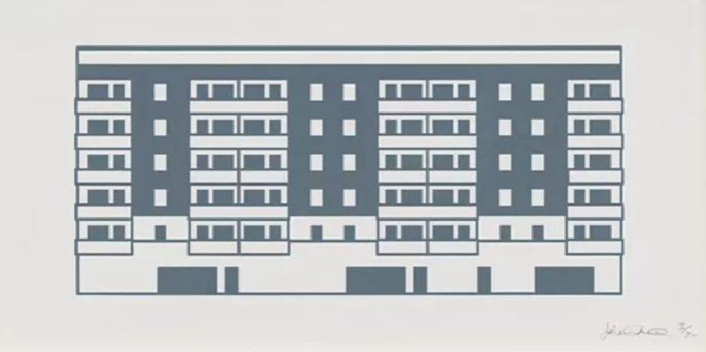 Woodcut on Somerset Velvet 300gsm. Hand-signed and numbered by the artist. Apartment 7 (2021) de Julian Opie es una xilografía sobre papel de 33 × 61 cm, firmada y numerada a mano por el artista. La obra representa un edificio de apartamentos estilizado en tonos planos azul y blanco, utilizando formas geométricas simplificadas y contornos marcados. Las ventanas y balcones repetidos crean un patrón rítmico de minimalismo arquitectónico. Opie reduce la estructura urbana a su esencia, destacando la uniformidad y la anonimidad de la vida urbana contemporánea. La pieza continúa su exploración visual de formas cotidianas en un lenguaje gráfico distintivo.