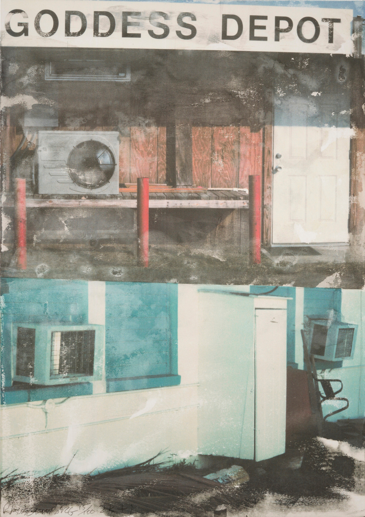 Printed by ULAE, West Islip, NY; Published by John Szoke Editions, New York. In Transit (Goddess Depot) de Robert Rauschenberg, creado en 2001, es una litografía en color que combina fotografía, texturas pictóricas y técnicas de impresión en capas para evocar una sensación de desplazamiento temporal y físico. La composición está dividida en dos registros fotográficos: la mitad superior muestra una fachada desgastada con el letrero “Goddess Depot,” postes rojos y una lavadora enmarcada por madera descolorida por el sol; la mitad inferior presenta paredes turquesas con unidades de aire acondicionado y objetos dispersos. El estilo característico de Rauschenberg—fusionar lo cotidiano con la ambigüedad poética—convierte estos detalles aparentemente comunes en una meditación visual sobre el movimiento, la decadencia y el residuo cultural. Impresa por ULAE y publicada por John Szoke Editions en una edición de 100, la obra explora la intersección entre la realidad y la imagen.