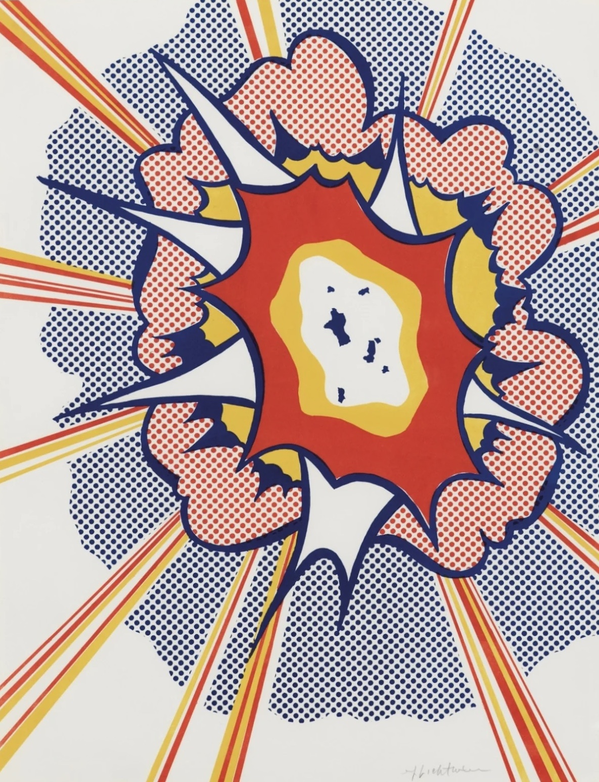 Litografía en colores sobre papel Rives; del portafolio 9. Firmada y numerada a lápiz. Literatura: Corlett 49. Publicada por Hollander Workshop, Nueva York. Explosion (1967) de Roy Lichtenstein expresa la vitalidad y el ingenio del Pop Art. Utilizando sus característicos puntos Ben?Day y colores vibrantes, el artista convierte una escena de impacto en una composición cuidadosamente calculada. La obra refleja la cultura visual de los años 60 y su relación con los cómics y los medios de masas.