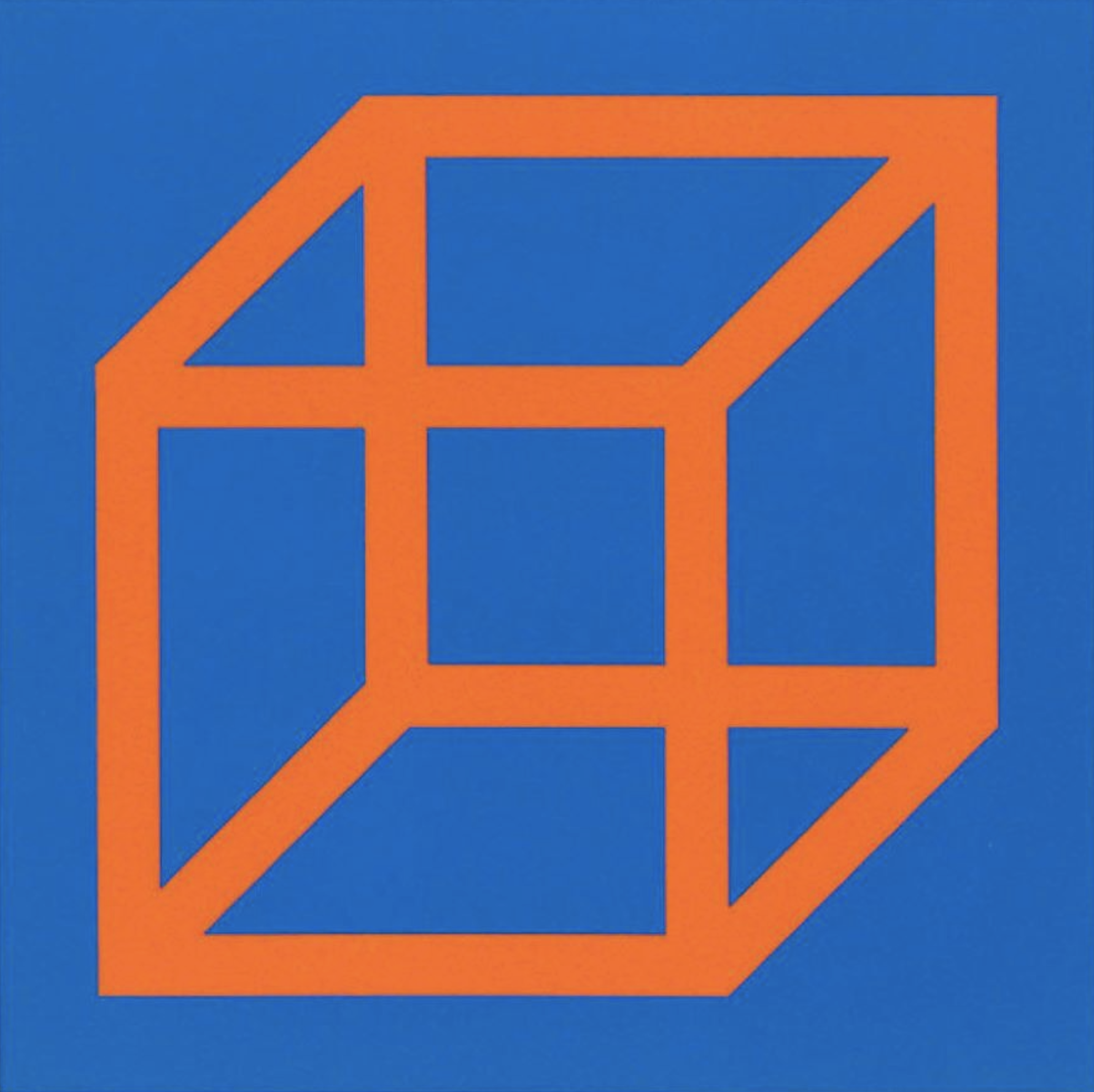 Linoleo on Paper. Not Signed. Cubes in Color on Color (Blue/Orange) de Sol LeWitt es una impresión en linóleo sobre papel de 2003 que ejemplifica su uso metódico del color y la geometría. Un cubo naranja brillante, dibujado en forma lineal, destaca intensamente sobre un fondo azul profundo. El uso de colores complementarios acentúa la ilusión de tridimensionalidad, haciendo que la figura parezca a la vez plana y espacial. Esta obra, como muchas en la práctica conceptual de LeWitt, se basa en un sistema de repetición y lógica, donde el resultado visual deriva de una idea predeterminada. Es una expresión clara de su interés por la percepción visual y la estructura minimalista.