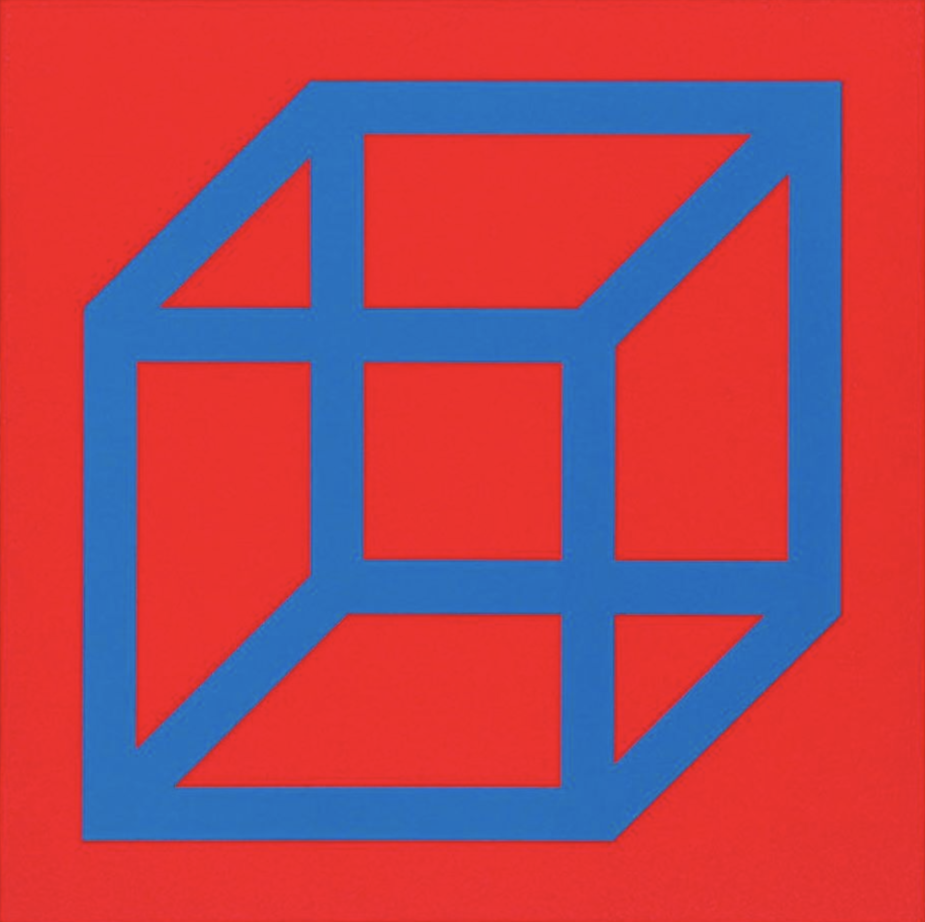 Linoleo on Paper. Not Signed. Cubes in Color on Color (Red/Blue) de Sol LeWitt, realizada en 2003, es una impresión en linóleo que reafirma su enfoque en la abstracción geométrica y el orden visual. Sobre un fondo rojo intenso se destaca un contorno azul de un cubo, creando un efecto óptico que altera la percepción del espacio. Parte de una edición limitada de 20, esta obra refleja la precisión conceptual de LeWitt en su práctica tardía.