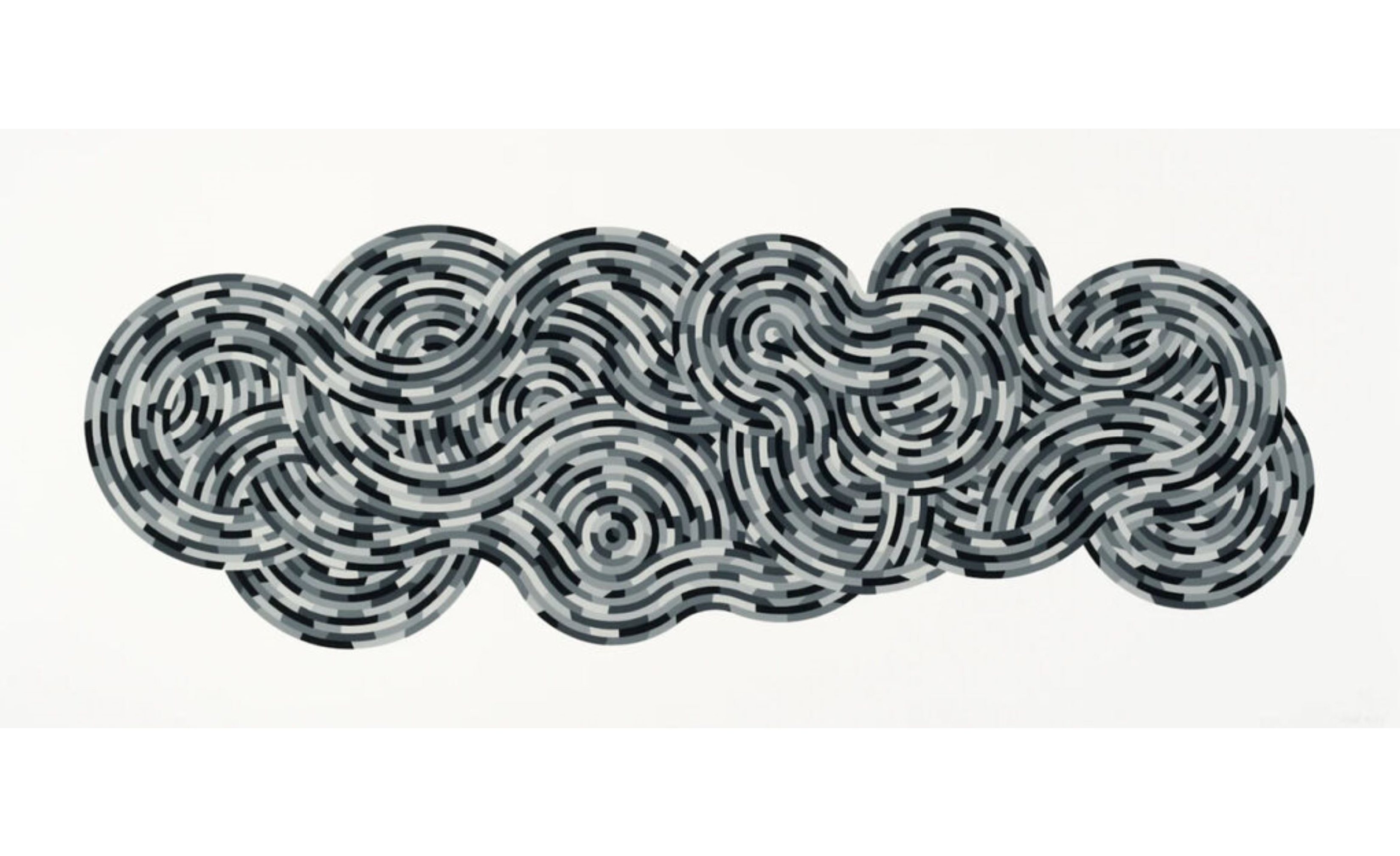 Linoleo on Paper. Not signed. Whirls and Twirls (Black) (2005) de Sol LeWitt es una muestra de su enfoque conceptual a través de la abstracción geométrica. Esta linografía presenta una serie de arcos concéntricos entrelazados en tonos negros, blancos y grises, formando una figura similar a una nube con un ritmo visual hipnótico. Alejado de la expresión emocional, LeWitt centra la obra en la repetición y la estructura formal. Esta edición limitada de 20 ejemplares refleja su fascinación por la lógica matemática aplicada al arte.