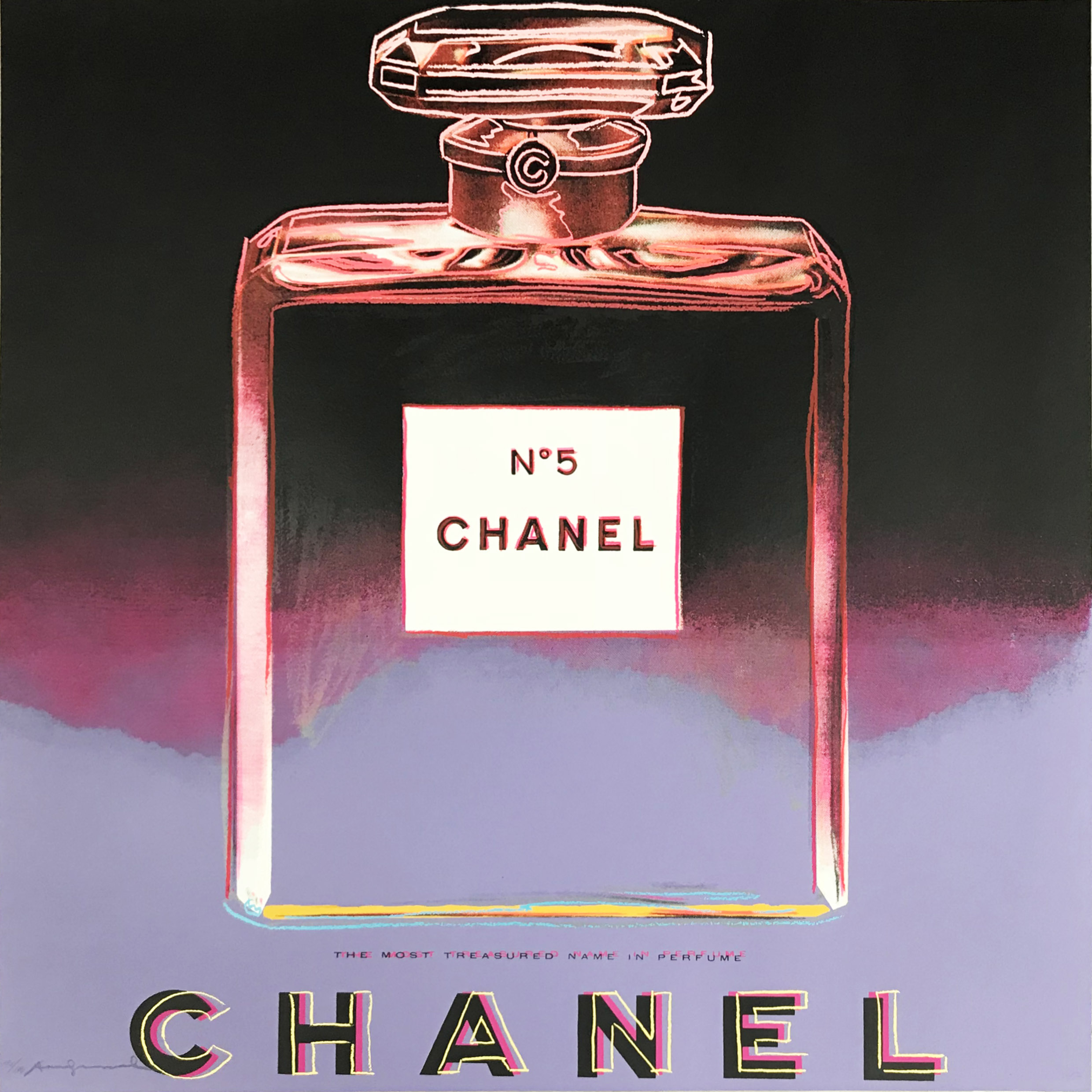 Screenprint on Lenox Museum Board // Chanel II.354 from ADS d'Andy Warhol, daté de 1985, est une sérigraphie en édition limitée qui met en lumière sa fascination pour le consumérisme et les marques iconiques. L'œuvre présente une image audacieuse et stylisée de la célèbre bouteille de parfum Chanel N°5, rendue dans des couleurs vives et contrastées sur un fond dégradé. L'éclat métallique sur la bouteille et le texte en dessous ajoutent une sensation de luxe, tandis que l'utilisation caractéristique de la répétition par Warhol et son attention portée aux objets commerciaux élèvent ce produit en un symbole iconique du luxe et de l'art moderne. L'interprétation de Warhol de la bouteille Chanel mélange son esthétique pop art avec l'identité de la marque, soulignant l'interaction entre l'art, la publicité et la culture de consommation.