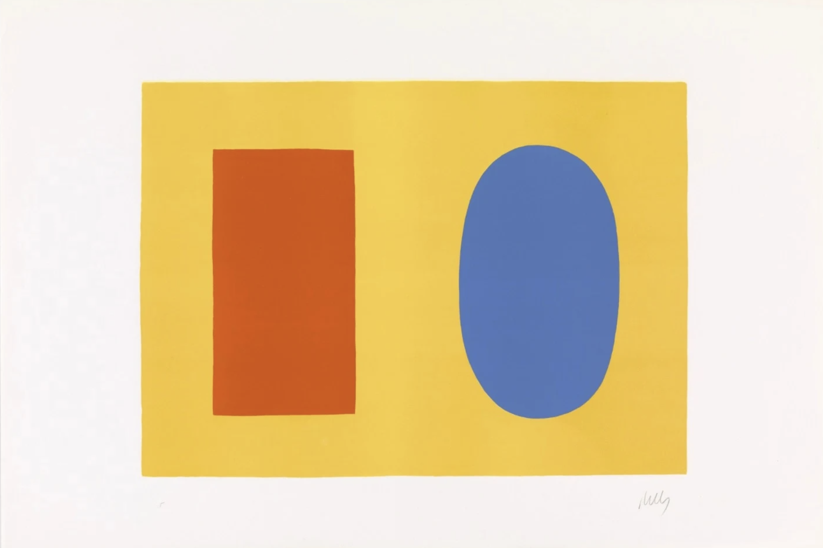 Orange and Blue over Yellow (1964–65) d’Ellsworth Kelly est une lithographie en couleurs saisissante qui réduit le langage visuel à ses formes géométriques les plus pures. Un rectangle orange vif et un ovale bleu froid se juxtaposent dans un champ jaune doré, leurs formes simples créant une tension dynamique entre équilibre et contraste. Les contours précis et les aplats francs de Kelly mettent en valeur les relations spatiales et le dialogue entre formes, reflétant son engagement envers l’abstraction hard-edge. La clarté de la composition invite à contempler l’harmonie entre couleur, forme et proportion.