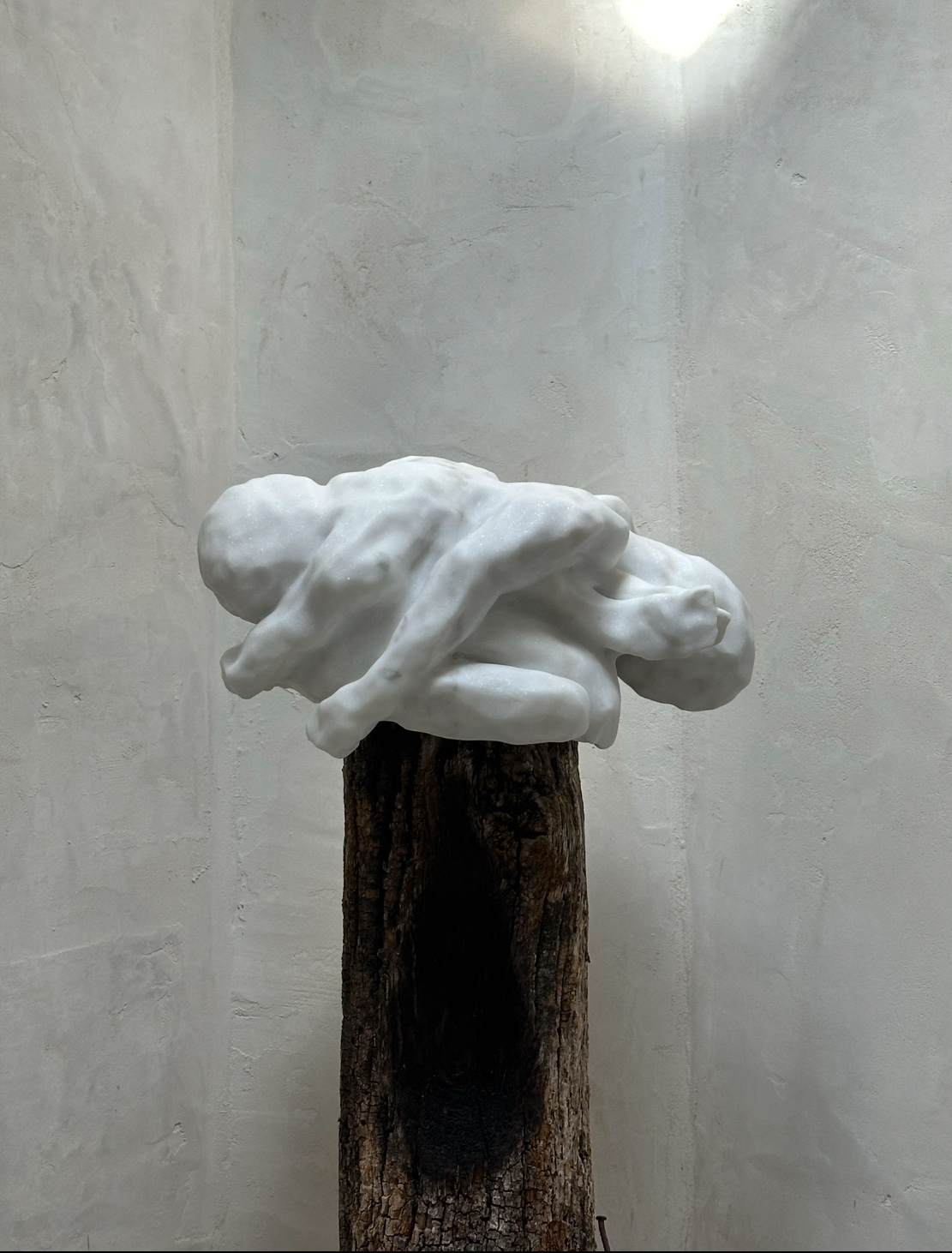 L’Amant (2025) d’Eva Claessens est une sculpture sensuelle en marbre représentant deux formes humaines entremêlées, fusionnant en une masse vaporeuse évoquant un nuage. Posée sur un socle rustique en bois, la surface lisse et lumineuse du marbre contraste avec la base sombre et texturée, renforçant l’impression d’intimité en apesanteur. Les figures semblent suspendues dans une étreinte intemporelle, leur anonymat en faisant des symboles universels de l’amour et du lien humain. Réalisée en seulement quatre exemplaires, cette pièce témoigne de la capacité de Claessens à allier profondeur émotionnelle et élégance sculpturale.