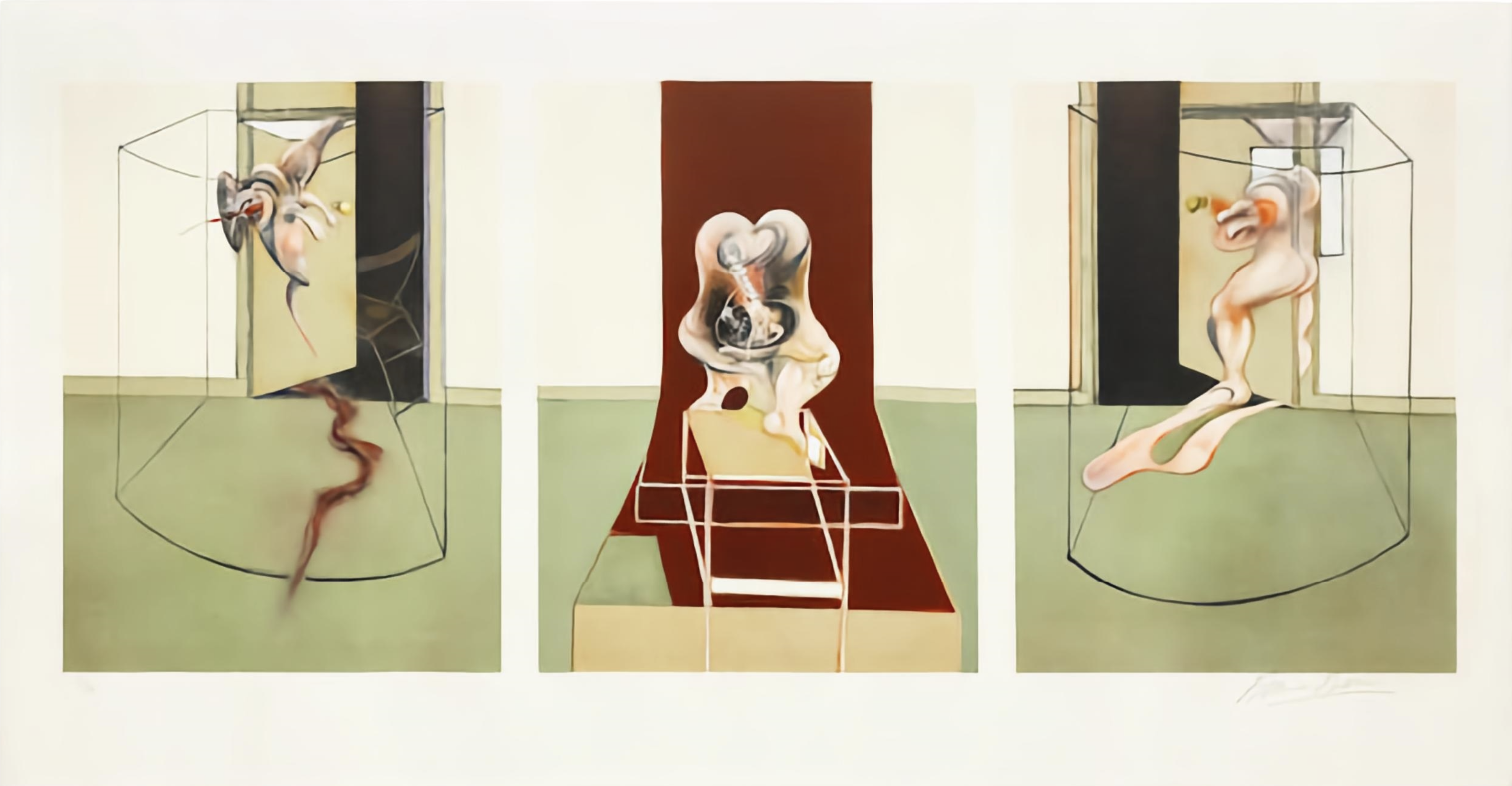 Three Lithographs in colours, on one sheet of Arches Infinity watermarked paper. Signed by the artist in pencil, with the printer's blindstamp, below left : ARTS.LITHO.PARIS. Triptych Inspired by Oresteia of Aeschylus (1981) de Francis Bacon est une lithographie troublante composée de trois panneaux reliés sur une même feuille. Inspirée de la tragédie grecque Orestie, elle évoque violence, mutation et souffrance psychique. Chaque figure, distordue à la manière typique de Bacon, est enfermée dans des structures géométriques vides. Le panneau central montre un corps déformé sur fond rouge sombre, encadré par des silhouettes énigmatiques sortant ou entrant par des portes sombres. Tirage limité à 150 exemplaires.