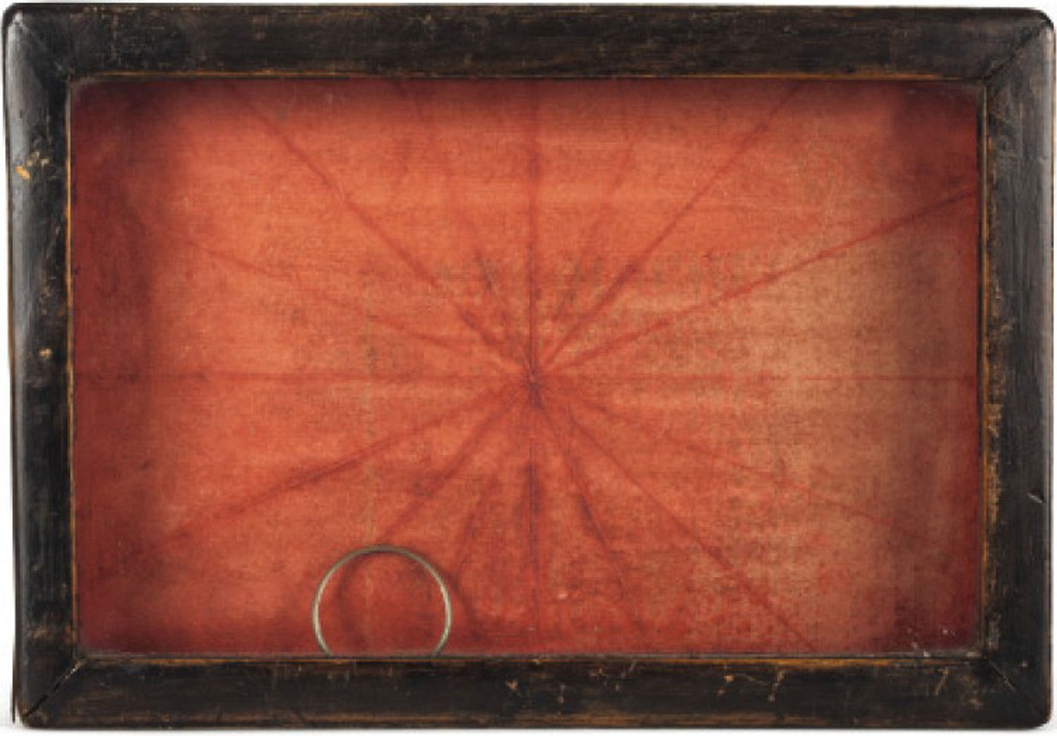 Mixed Media Collage, glass, wood, sand, metal and paper in wooden box construction - Signed on reverse // Untitled (Black Sand Box) de Joseph Cornell, créée vers 1950, est un assemblage en techniques mixtes qui reflète l'approche unique de Cornell envers la sculpture et sa fascination pour la mémoire, la nostalgie et le passage du temps. Cette œuvre, construite dans une boîte en bois peu profonde, présente une composition méticuleusement arrangée de matériaux tels que du sable, du verre, du métal et du papier. L'arrière-plan rouge dominant à l'intérieur de la boîte présente un motif rayonnant, semblant émaner d'un petit anneau métallique situé près du bord inférieur, ajoutant une dimension de profondeur et de contemplation à la pièce. Le cadre noir patiné renforce la qualité mystérieuse et évocatrice de l'œuvre.Cornell, connu pour ses boîtes à ombres et son utilisation d'objets trouvés, transformait souvent des matériaux simples en assemblages poétiques et oniriques. La simplicité abstraite de cette pièce invite à la réflexion sur des thèmes comme l'impermanence et l'introspection. Signée au dos, cette œuvre illustre la capacité de Cornell à créer des mondes intimes et énigmatiques dans des espaces confinés, mêlant le tangible à l'imaginaire.