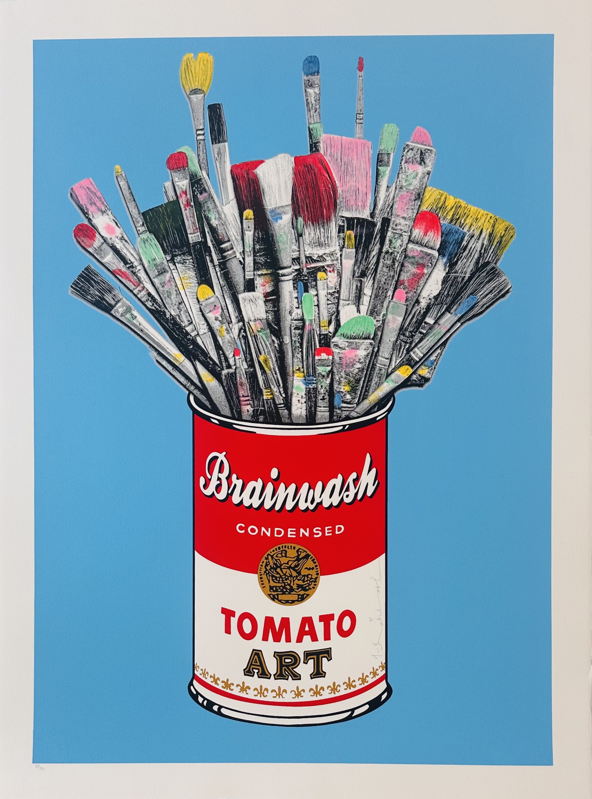 Screen print in 4 colors. Signed, numbered, and dated. Tomato Pop // Blue (2023) de Mr. Brainwash est une sérigraphie en quatre couleurs qui revisite avec humour l’emblématique boîte de soupe de Warhol. Ici, la boîte “Brainwash Condensed Tomato Art” déborde de pinceaux tachés de peinture. Sur un fond bleu uni, l’œuvre célèbre la créativité et l’abondance artistique. Mr. Brainwash mêle l’héritage du Pop Art à l’énergie du street-art, transformant l’icône commerciale en une déclaration ironique sur la culture contemporaine.