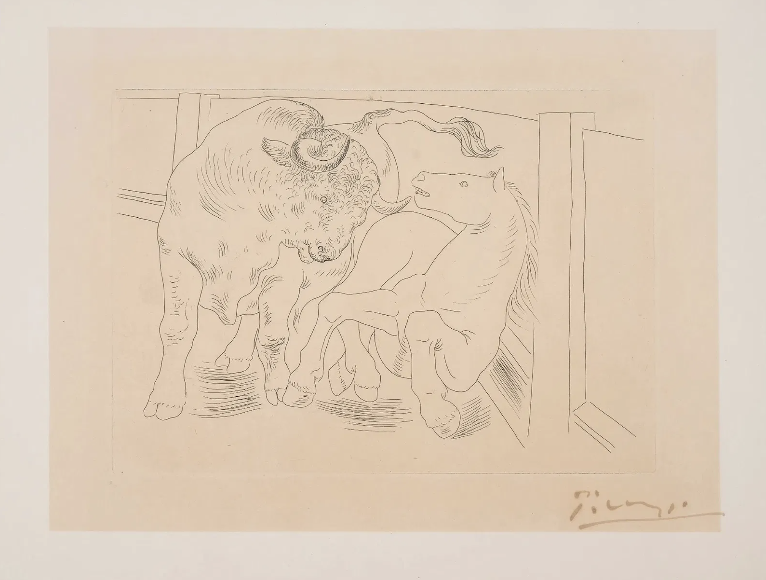 Published by Ambrose Vollard, Paris, Etching on van Gelder holland wove paper. Signed in bistre. Taureau et Cheval (1927) de Pablo Picasso est une eau-forte délicate représentant une scène entre un taureau et un cheval dans un enclos. Réalisée avec des lignes précises sur papier Van Gelder Holland, cette œuvre conjugue un thème classique avec l’abstraction moderne caractéristique de Picasso. Les formes épurées mais expressives annoncent les motifs que l’artiste développera plus tard dans Guernica (1937). Il s’agit ici d’une épreuve hors tirage principal de 107 exemplaires, signée à l’encre bistre, ce qui en fait une pièce rare dans l’œuvre gravée de Picasso.