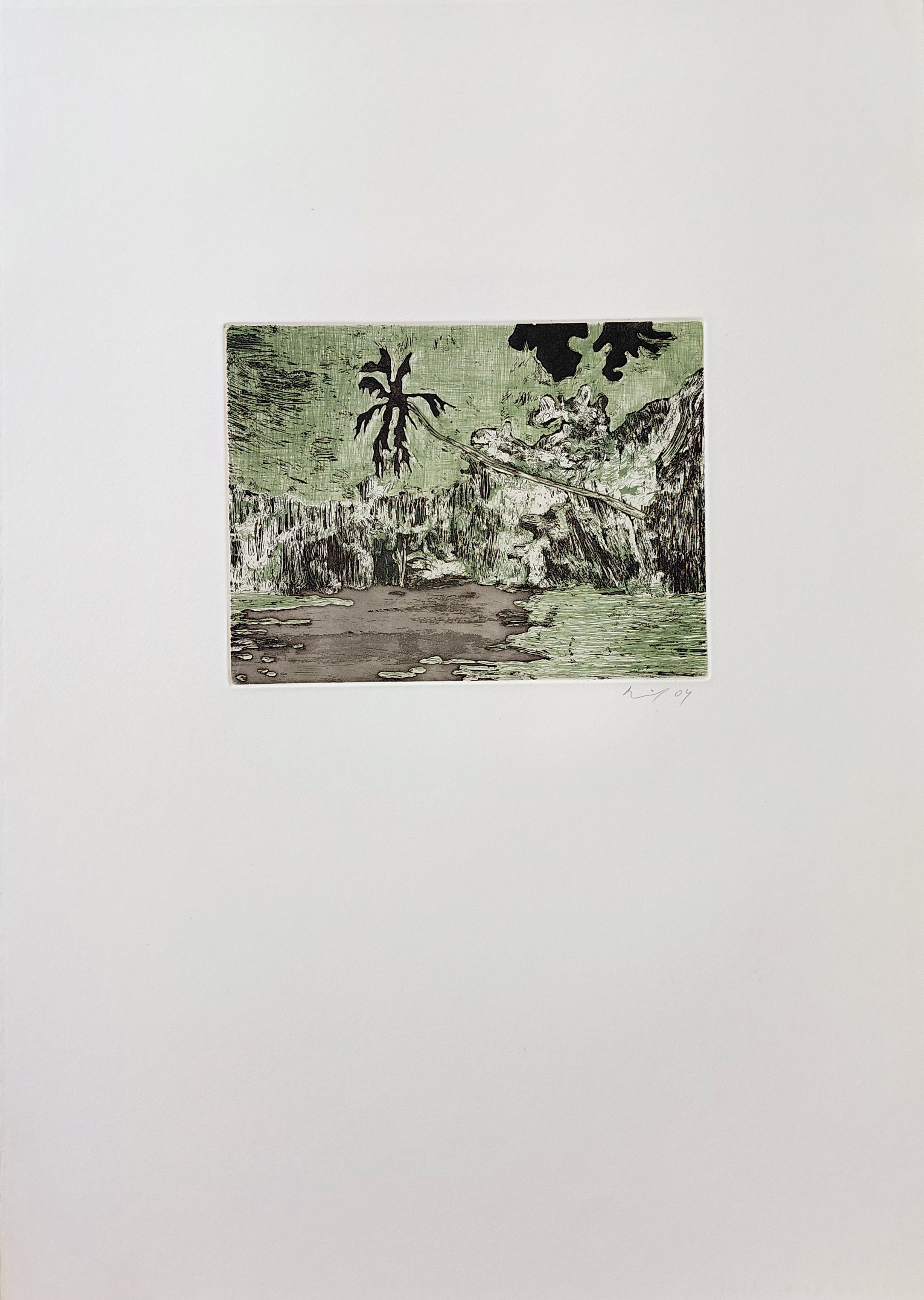 Signée et datée, non numérotée. – Publiée par Griffelkunst, Hambourg, Allemagne. – Issue du portfolio Black Palm. – Dimensions de l’image : 14,5 × 19,5 cm. – Dimensions de la plaque : 53,5 × 37,5 cm. Black Palm (2004) de Peter Doig est une eau-forte qui illustre sa manière poétique et onirique de représenter le paysage. Dans des tons verts et noirs atténués, l’image montre une scène tropicale dense, marquée par un palmier noir incliné au-dessus d’une étendue d’eau. Les lignes gravées créent une texture riche et une profondeur visuelle qui renforcent l’ambiguïté entre réalité et imagination. Tirée du portfolio Black Palm, cette estampe a été publiée par Griffelkunst à Hambourg. Signée et datée, elle fait partie d’un tirage de 119 exemplaires.