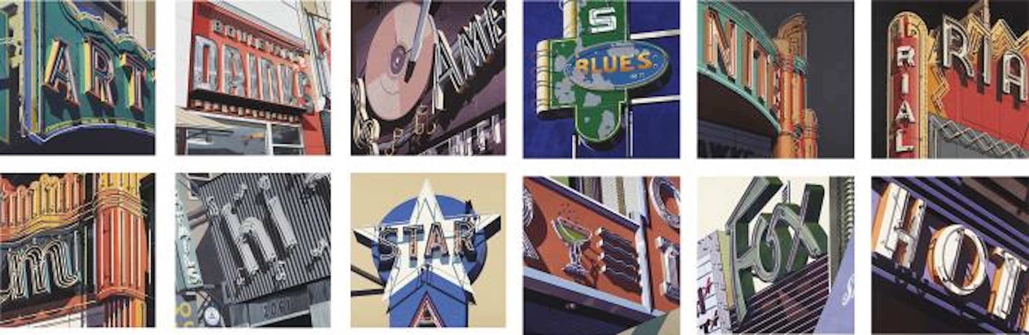 The complete set of twelve screenprints in colors, on wove paper, with full margins, - 40 1/8 x 39 1/8 in (101.9 x 99.4 cm) all signed, dated `2009' and numbered 5/100 in pencil, published by Exhibit A Fine Art and Editions and American Images Atelier, New York, all in excellent condition, contained in original gray silk-covered box with artist and title embossed with gold foil. // American Signs de Robert Cottingham est une série de sérigraphies en édition limitée de 2009, composée de douze estampes distinctes, chacune mettant en valeur des enseignes américaines emblématiques. Les compositions capturent des vues rapprochées de néons et de marquises de théâtres, d'hôtels et d'autres commerces, présentant une riche variété de typographies et de designs emblématiques de l'Amérique des années 1950. Chaque pièce est méticuleusement détaillée, avec des couleurs vives et des lettres audacieuses qui évoquent une nostalgie pour les paysages urbains et l'attrait des enseignes commerciales. Signée, datée et numérotée par l'artiste, la série est présentée dans une luxueuse boîte en soie grise avec un titre embossé en feuille d'or, soulignant sa qualité de collection. Le travail de Cottingham célèbre l'art de la culture commerciale américaine, immortalisant ces enseignes comme symboles d'une époque révolue.