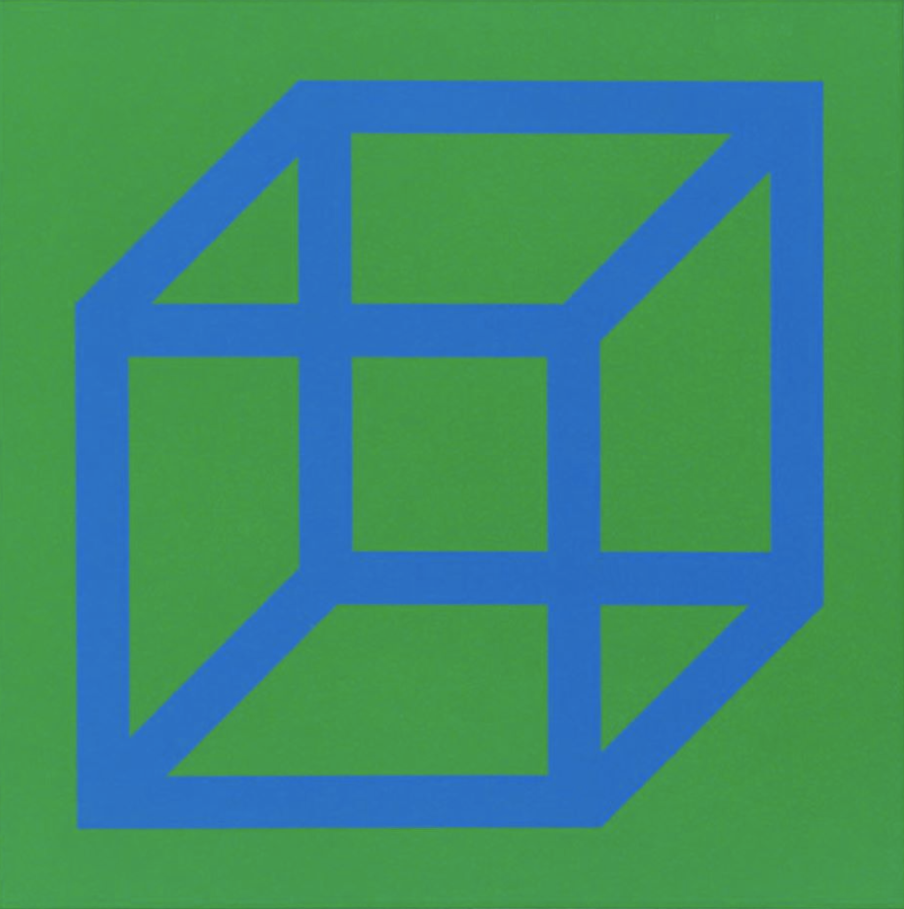 Linoleo on Paper. Not Signed. Cubes in Color on Color (Green/Blue) de Sol LeWitt, créée en 2003, reflète sa démarche conceptuelle et minimaliste. La linogravure montre un cube bleu sur un fond vert éclatant, jouant entre planéité et profondeur. Cette œuvre, tirée à seulement 20 exemplaires, explore méthodiquement les rapports de couleur et la perception de l’espace.