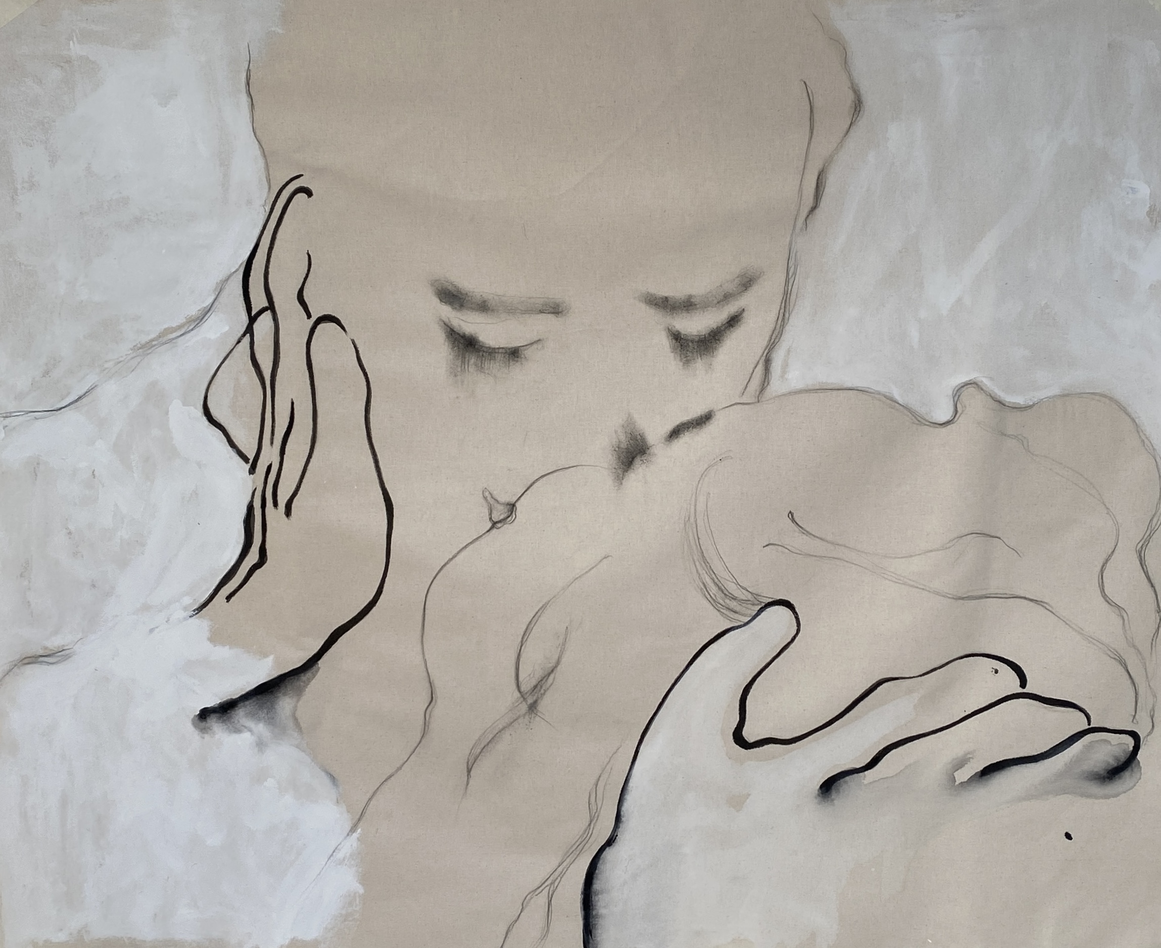 Mixed media on canvas. Un Baiser (2025) d’Eva Claessens est une peinture en techniques mixtes sur toile mesurant 100 × 130 cm. L’œuvre saisit un moment intime entre deux figures, dessinées avec des lignes noires fluides et délicates, accompagnées de légers ombrages. Leurs visages sont tendrement rapprochés dans un baiser, les yeux fermés, évoquant la vulnérabilité et l’affection. Réalisée sur toile brute avec des touches de blanc et très peu de couleur, cette pièce illustre le minimalisme poétique et la profondeur émotionnelle caractéristiques de Claessens.