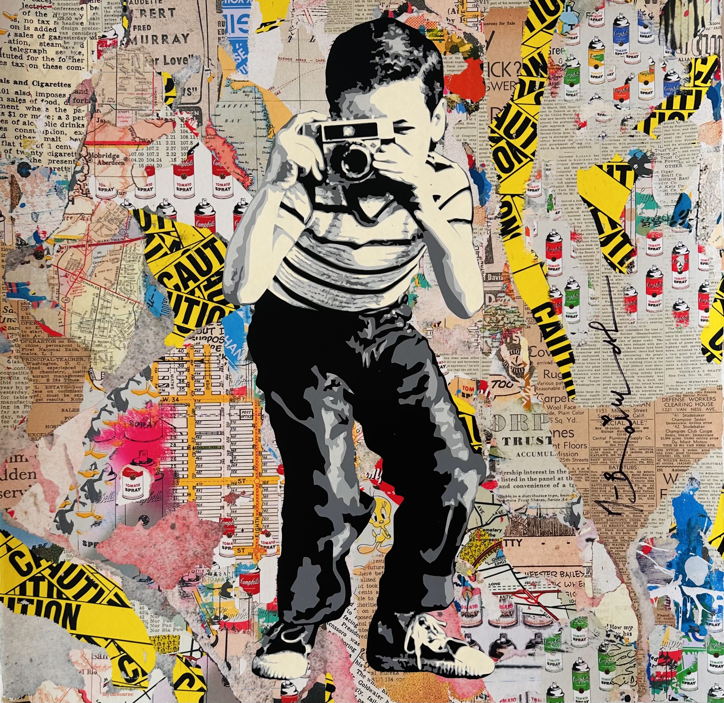 Mixed media on paper. Signed and dated. — Let op: voor levering van dit kunstwerk binnen de EU geldt een extra btw-heffing van 19%. Smile (2024) van Mr. Brainwash toont een jongen met een vintage camera, temidden van een explosieve collage van krantenknipsels, waarschuwingslinten, Campbell’s-spuitbussen, kaarten en teksten. De zwart-witte figuur vormt een krachtig contrast met de levendige achtergrond, uitgevoerd in de kenmerkende stencilstijl van de kunstenaar. Het werk roept nostalgie en kinderlijke onschuld op, met een knipoog naar de mediaoverdaad van vandaag en de magie van het vastleggen van een gelukkig moment.