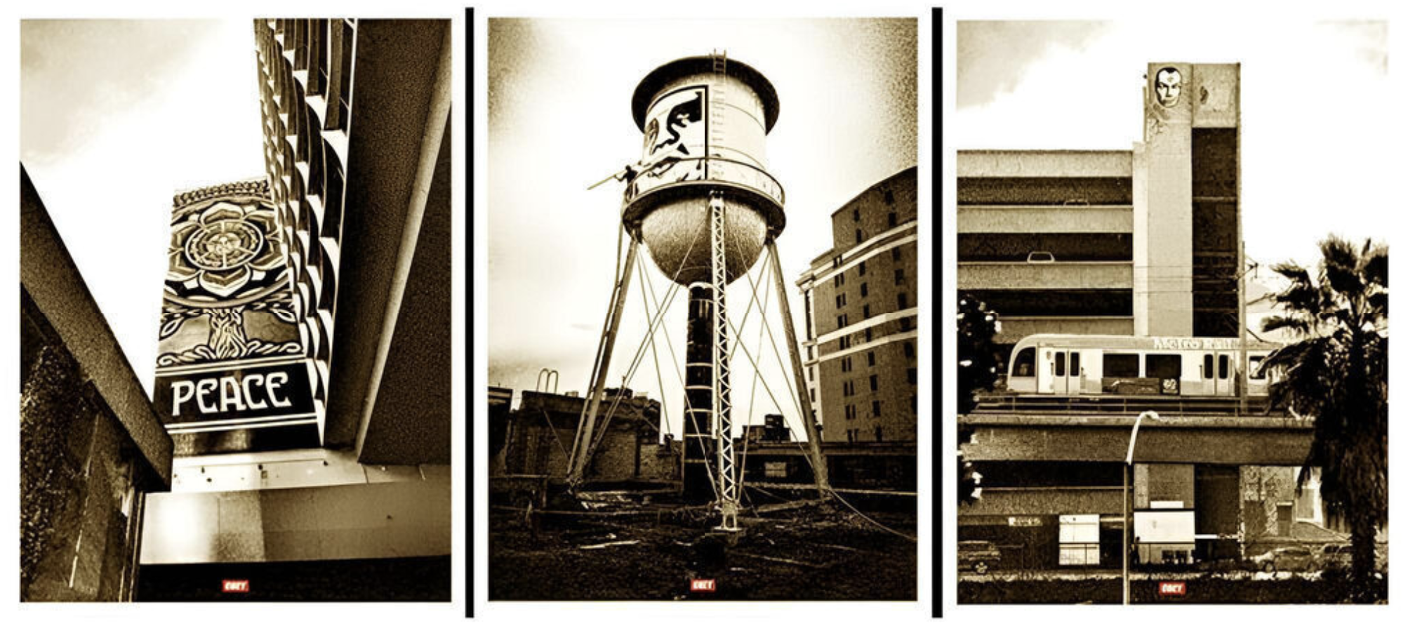 Covert to Overt (gold) van Shepard Fairey uit 2016 is een zeefdruk waarin stedelijke interventies worden weergegeven in een drieluik. In warme sepia-gouden tinten toont elk paneel architecturale scènes met Fairey’s bekende symbolen, zoals het “Obey”-icoon en de krachtige boodschap “Peace”. Het centrale beeld van een beschilderde watertoren benadrukt de overgang van ondergrondse kunst naar publieke zichtbaarheid. De prent weerspiegelt Fairey’s kritiek op propaganda en zijn visuele strijd in de openbare ruimte. Oplage van 350.