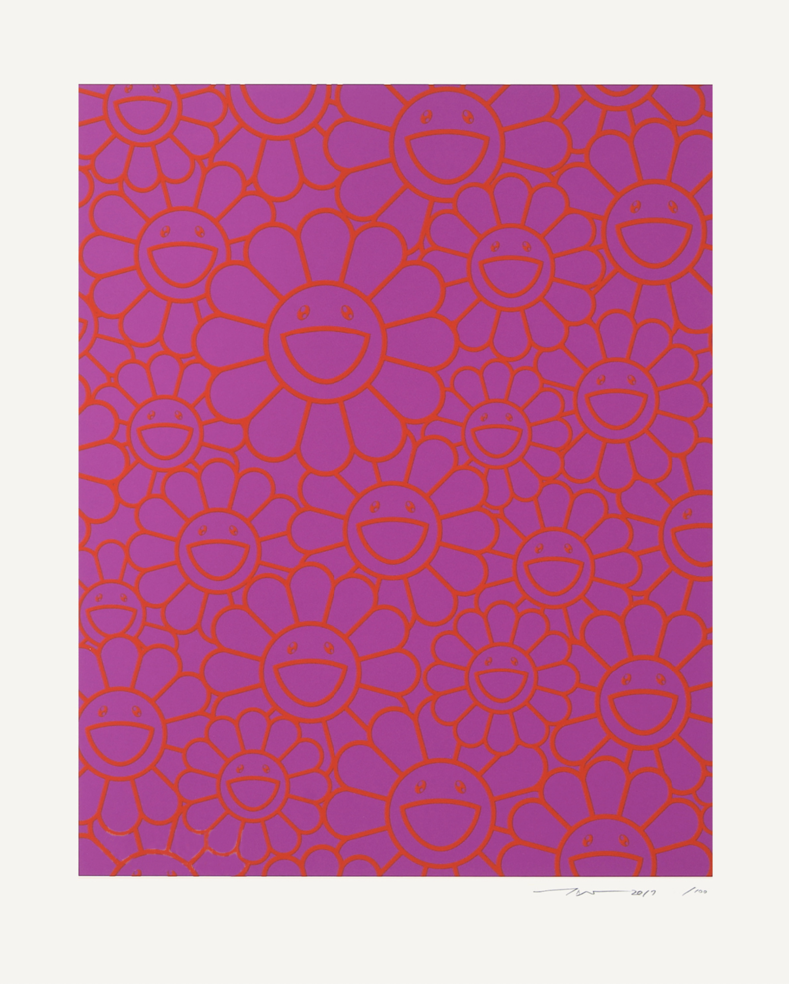 October Story Silkscreen (Orange Lavender Flowers) (2019) van Takashi Murakami is een opvallende zeefdruk met zijn iconische motief van glimlachende bloemen. Tegen een lavendelpaarse achtergrond vormen de oranje omlijnde bloemen een ritmisch en bijna hypnotisch patroon. De eenvormigheid van de uitdrukkingen—alle bloemen stralen vreugde uit—suggereert een overweldigende vrolijkheid, maar het sterke kleurcontrast nodigt uit tot een diepere beschouwing van herhaling, emotie en oppervlak. Dit werk toont Murakami’s vermogen om popcultuurbeelden te combineren met conceptuele gelaagdheid, waarbij een ogenschijnlijk eenvoudig bloemenpatroon verandert in een doordachte reflectie op geluk en massaproductie.