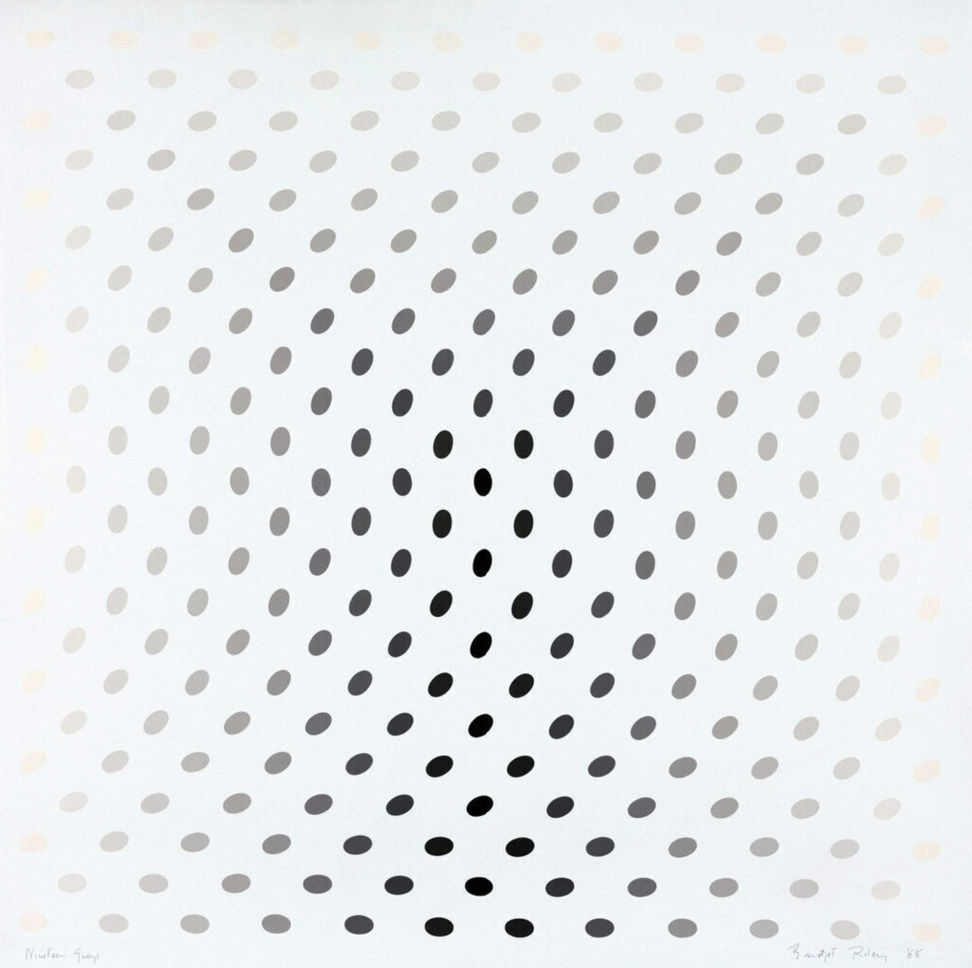 Nineteen Greys C (1968) by Bridget Riley exemplifies her mastery of optical rhythm and visual perception. This screenprint consists of a grid of oval forms that subtly shift through nineteen tonal variations of grey, from soft beige to deep black. Against a white background, the ellipses appear to ripple inward, creating an illusion of movement and depth. Part of Riley’s “Nineteen Greys” series, this work reflects her systematic approach to color and form, using repetition and gradation to challenge the viewer’s visual stability. Produced in an edition of 75, it stands as a landmark in the Op Art movement.