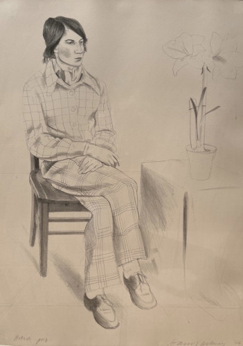 Lithograph on Arches paper. Signed by the artist. Yves Marie (1974) by David Hockney is a lithograph that captures the quiet introspection of a seated figure rendered in delicate pencil strokes. The subject, posed in a relaxed but formal posture, sits beside a small table bearing a flowering plant—adding a subtle organic counterpoint to the geometric pattern of the subject’s plaid trousers and checked shirt. Hockney’s attention to texture and surface detail imbues the composition with a quiet realism, while the empty space and minimal background highlight the figure’s introspective mood. The piece reflects Hockney’s enduring interest in portraiture and human presence, executed with refined lithographic technique.