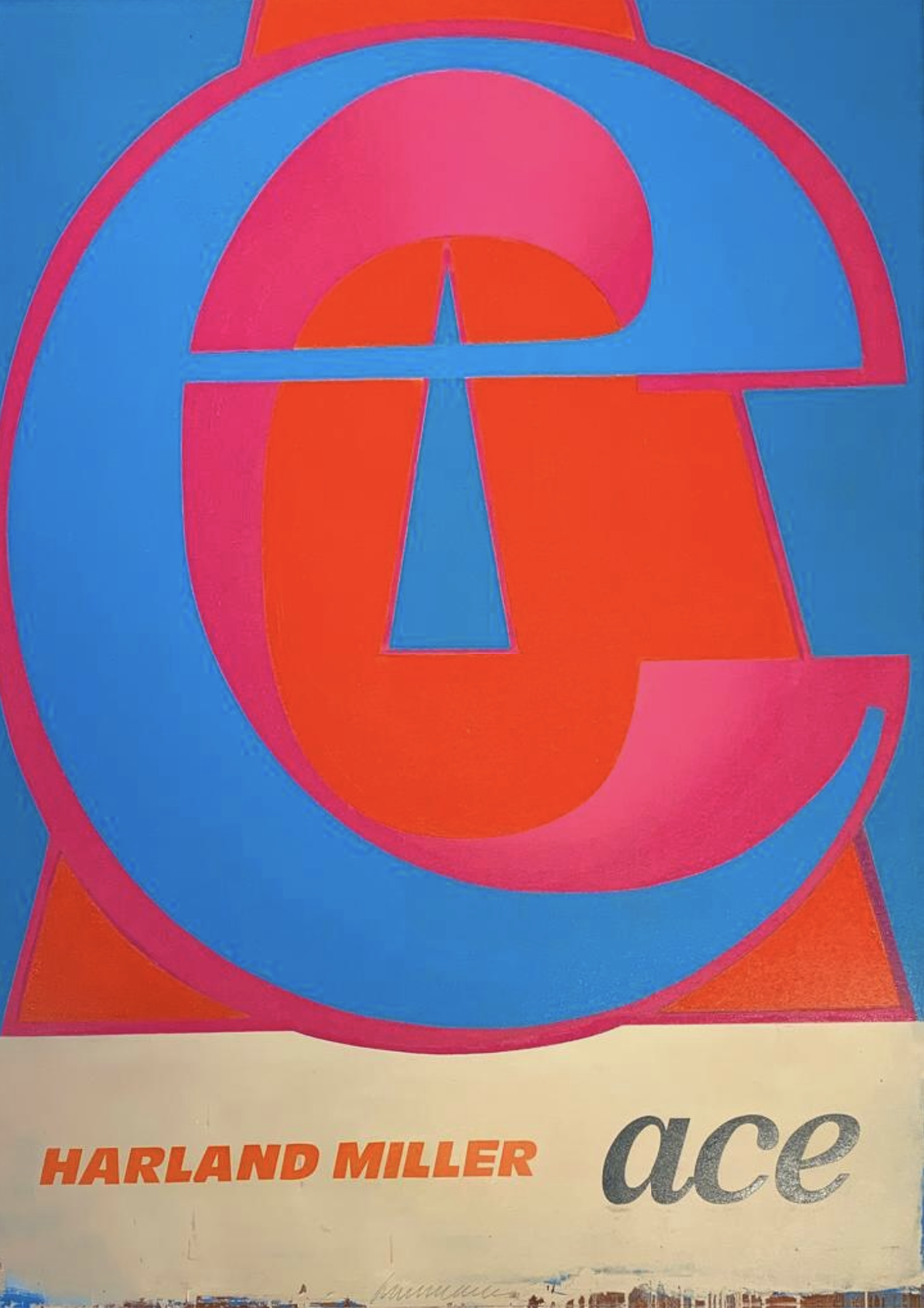 Etching with woodcut. Ace (2019) by Harland Miller is a bold fusion of text, geometry, and saturated color, executed in etching with woodcut. Dominated by a monumental letterform in electric blue, vivid red, and hot pink, the composition plays with typographic abstraction, its sharp edges softened by the textured impression of the printmaking process. The lower register, featuring Miller’s name and the word ace in contrasting typefaces, recalls vintage book covers while exuding contemporary pop energy. This edition of 50 exemplifies Miller’s skill in blending literary references, graphic design, and painterly sensibility into a striking visual statement.