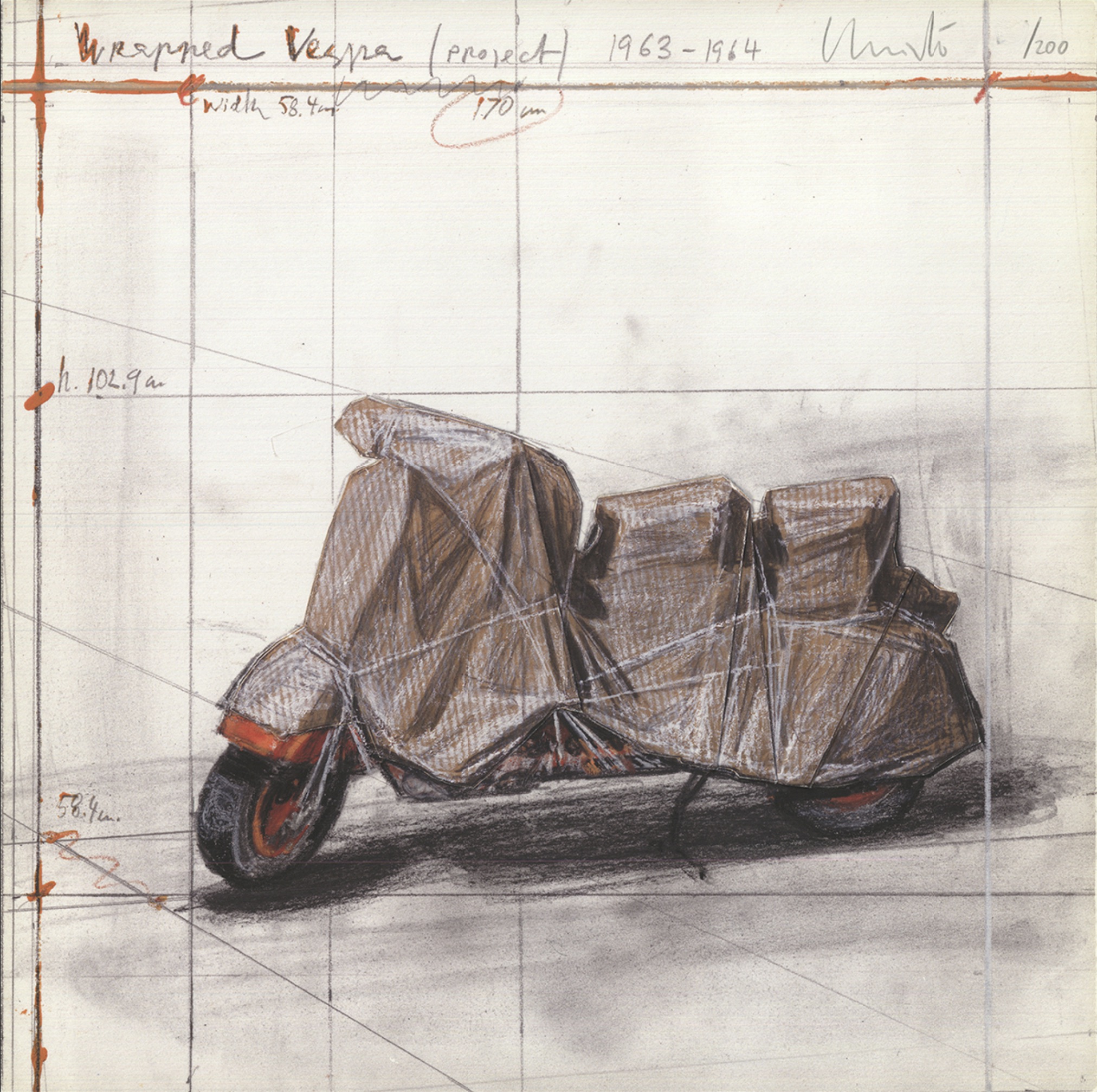 Digital pigment print with collage and hand-coloring. - Signed and numbered in pencil. - Publisher: Masa Yanagi, Kapan Wrapped Vespa (2006) by Christo is a digital pigment print featuring collage and hand-coloring, presenting one of the artist’s iconic wrapped objects. Referencing a project from 1963–1964, the work shows a Vespa motorcycle enveloped in fabric and bound with string, rendered with meticulous shading and overlaid with measurements and notations. The piece encapsulates Christo’s ongoing fascination with concealment, transformation, and the interplay between object and environment. With its technical precision and sculptural sensibility, it also reflects Christo’s practice of combining art, architecture, and conceptual planning.