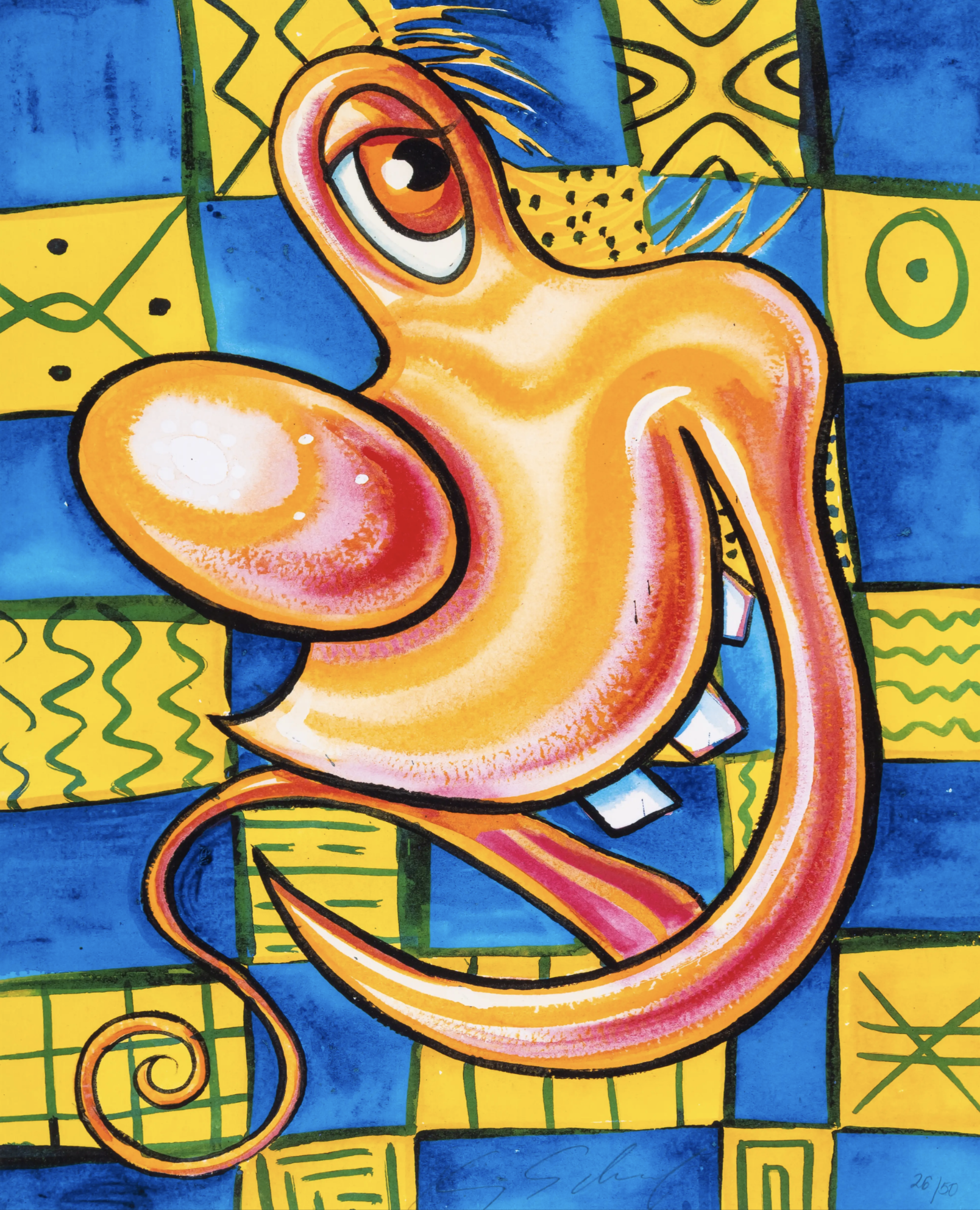 Archival pigment print in colours, on Somerset wove paper. Signed in pencil, numbered from the edition of 50. Included in the Hommage À Domberger portfolio. Published by Domberger KG, Fiderstadt, in the original mount with the publisher's blindstamp. Untitled (Grinning Whimsy) (2002) by Kenny Scharf is a vibrant archival pigment print that fuses playful surrealism with comic energy. A grinning, exaggerated face with bulging features and a spiral chin dominates the composition, set against a patterned checkerboard of vivid yellow and deep blue. The background is filled with abstract, tribal-like motifs that add rhythm and contrast. Scharf’s bold colors, fluid outlines, and whimsical character design reflect his connection to the 1980s East Village art scene and his roots in pop and street art. This print, from an edition of 50, was published by Domberger KG and captures Scharf’s signature fusion of humor, psychedelia, and visual exuberance.