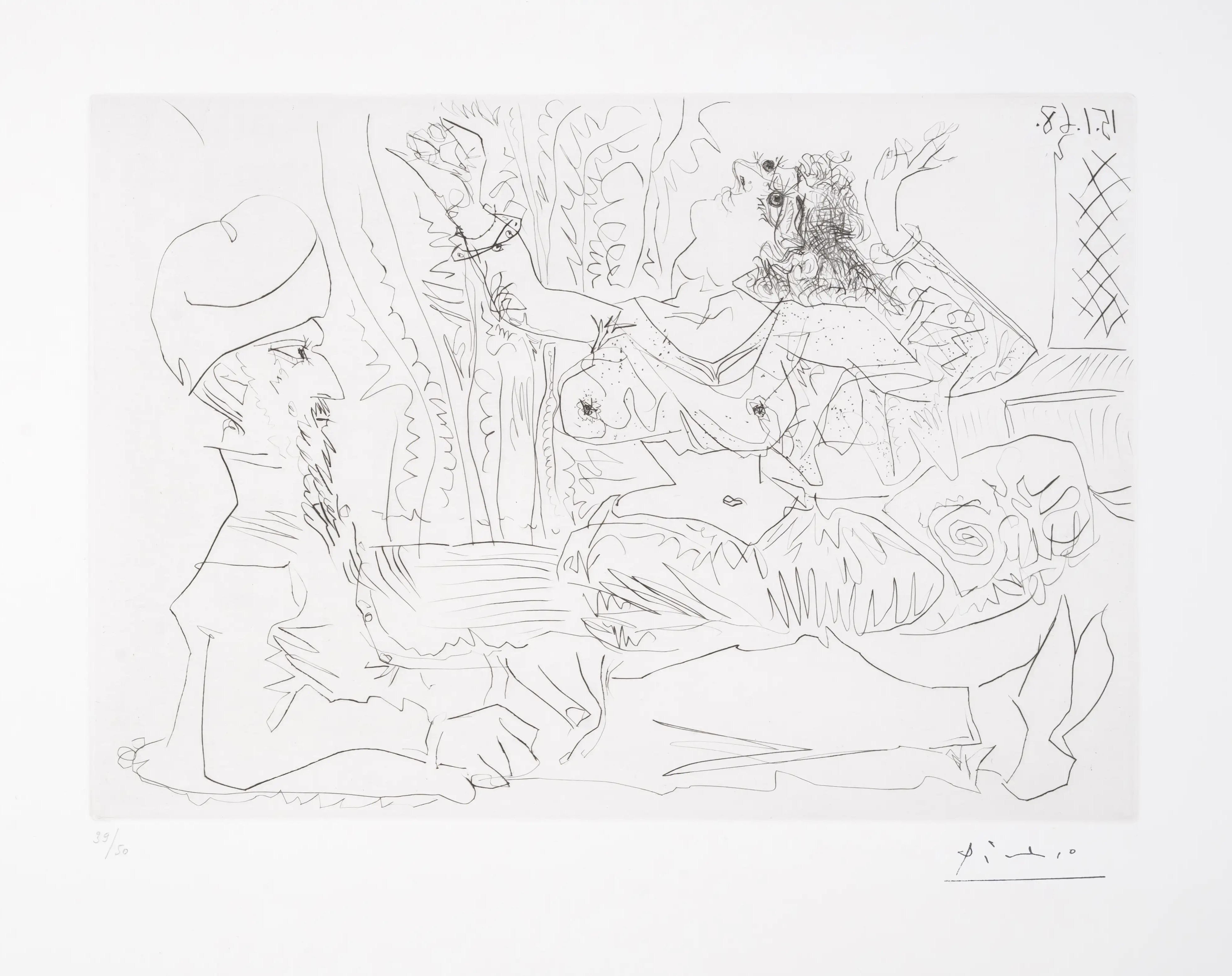 Etching with drypoint, on BFK Rives paper. With the artist's stamped signature, numbered in pencil. Literature: Bloch 1458. Reclining Man in Turban and Belly Dancer (1968) by Pablo Picasso is an etching with drypoint, characterized by its fluid, spontaneous linework and erotic subject matter. The composition features a reclining man wearing a turban gazing at a provocatively posed belly dancer, rendered in Picasso’s distinctive late style—marked by expressive distortion and playful, intertwining forms. Created during a period when the artist was revisiting themes of desire, voyeurism, and myth, this print is numbered from an edition of 50 and stamped with Picasso’s signature. It is printed on BFK Rives paper with full margins.