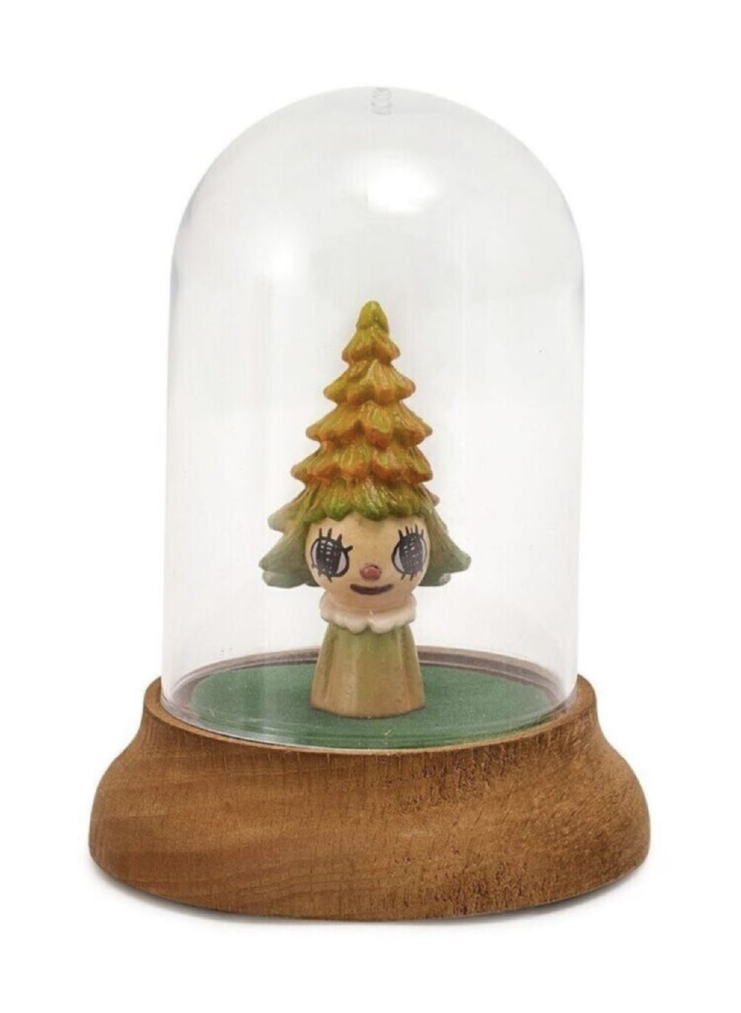 Resin, wood and plastic sculpture. Not signed. Mini Mori Girl (2012) by Yoshitomo Nara is a small-scale resin, wood, and plastic sculpture that encapsulates the artist’s whimsical and melancholic charm. Encased in a clear dome atop a wooden base, the figure features a tree-headed girl with wide, expressive eyes and a subtle, enigmatic smile. Measuring just 11.5 cm tall, the piece blends innocence with a surreal twist, characteristic of Nara’s childlike yet emotionally charged characters. The sculpture’s title, referencing "Mori Girl" (a Japanese subculture that romanticizes forest life), deepens its connection to nature and nostalgia, while its toy-like scale adds a touch of intimacy and tenderness.